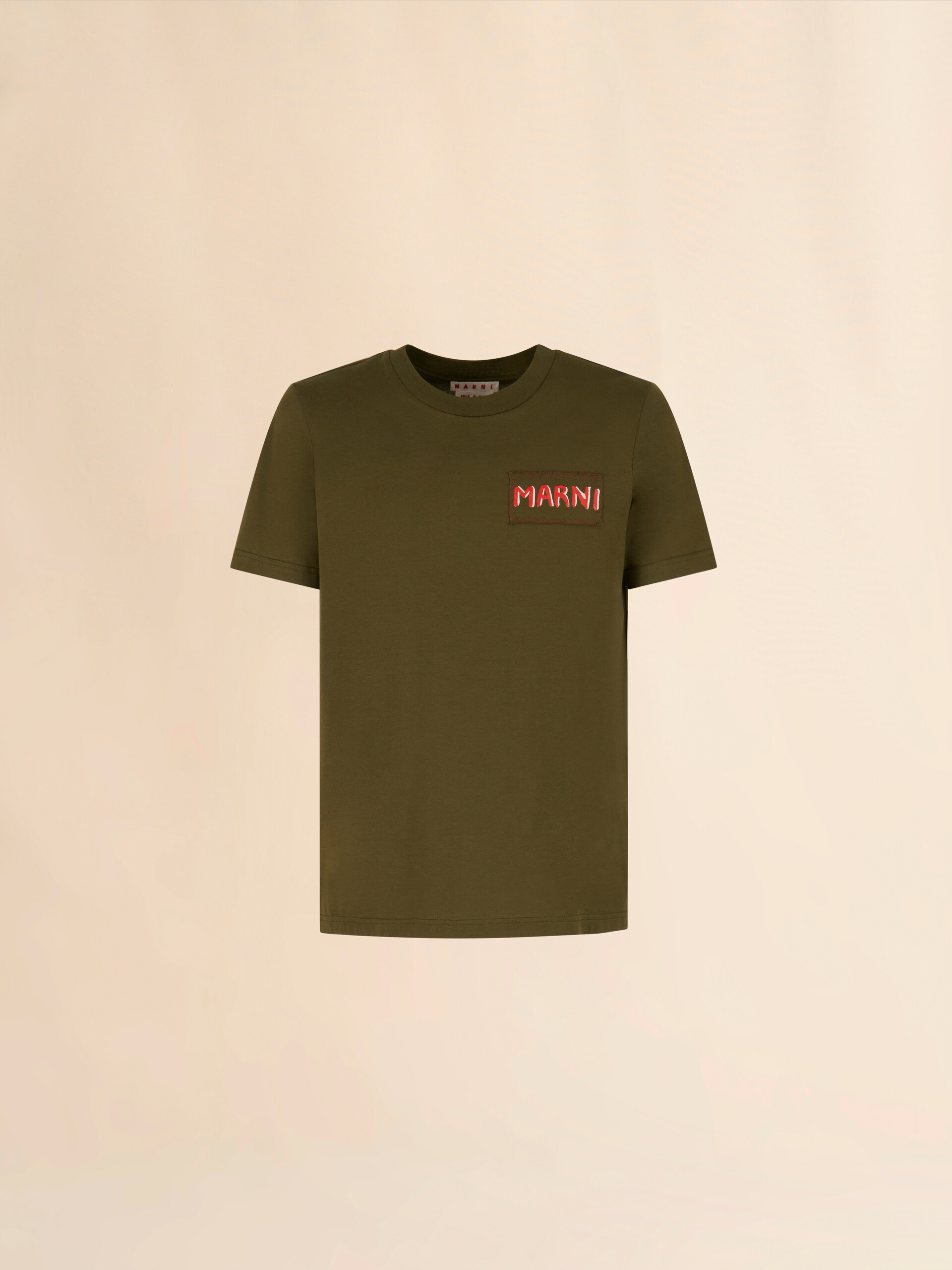 T-Shirt aus Bio-Baumwolljersey. Normale Passform mit Rundhalsausschnitt und kurzen Ärmeln. Verziert mit einem Stick-Etikett auf der Brust mit Marni-Logo. Made in Italy