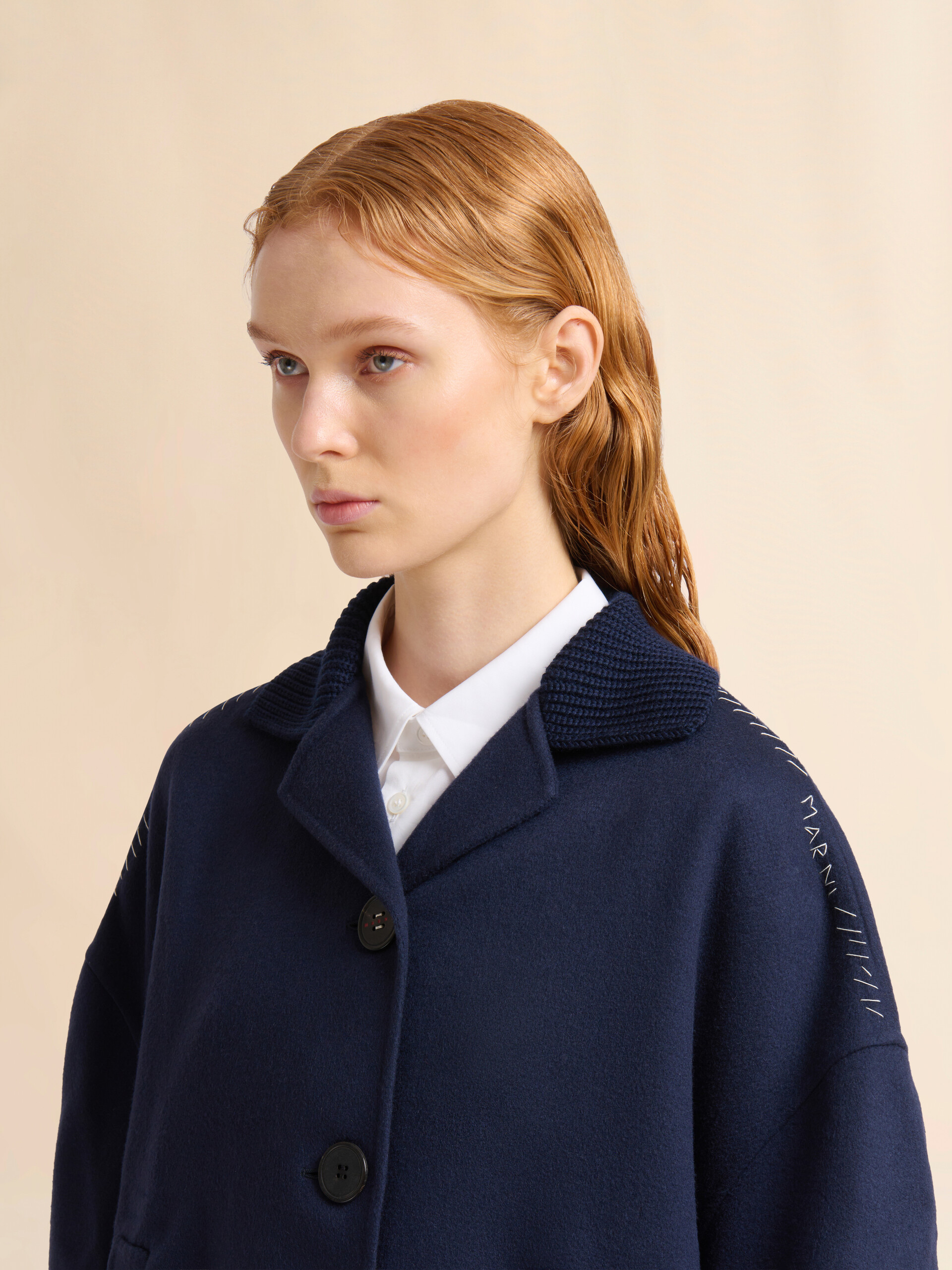 Doubleface-Jacke aus leichter Wolle und Kaschmir. Gestrickter Kragen und Manschetten. Lässige Passform mit überschnittenen Schultern und dreifachem Knopfverschluss. Von Hand aufgestickter Marni-Flicken mit Blumen-Detail auf der Schulter. Made in Italy