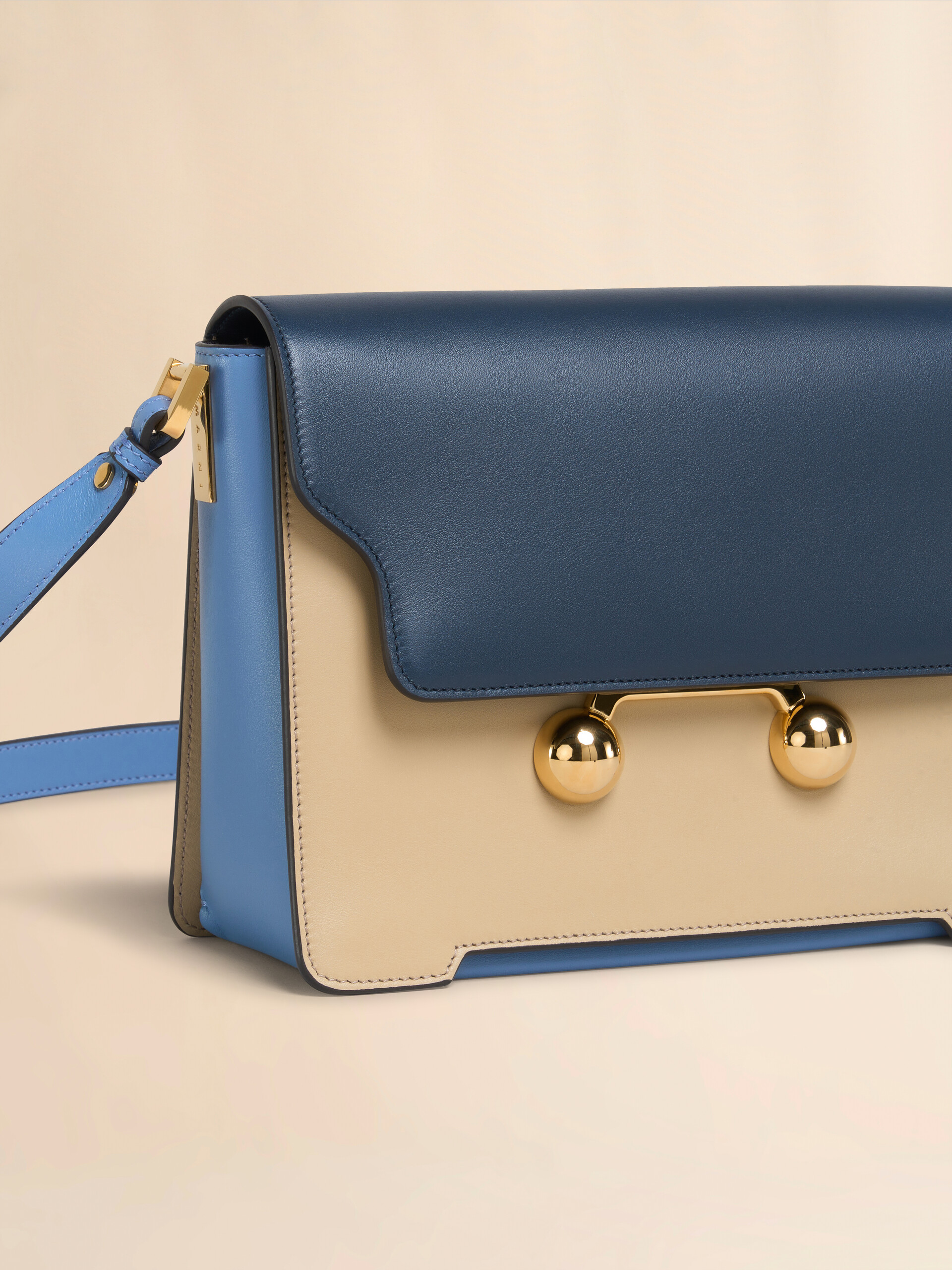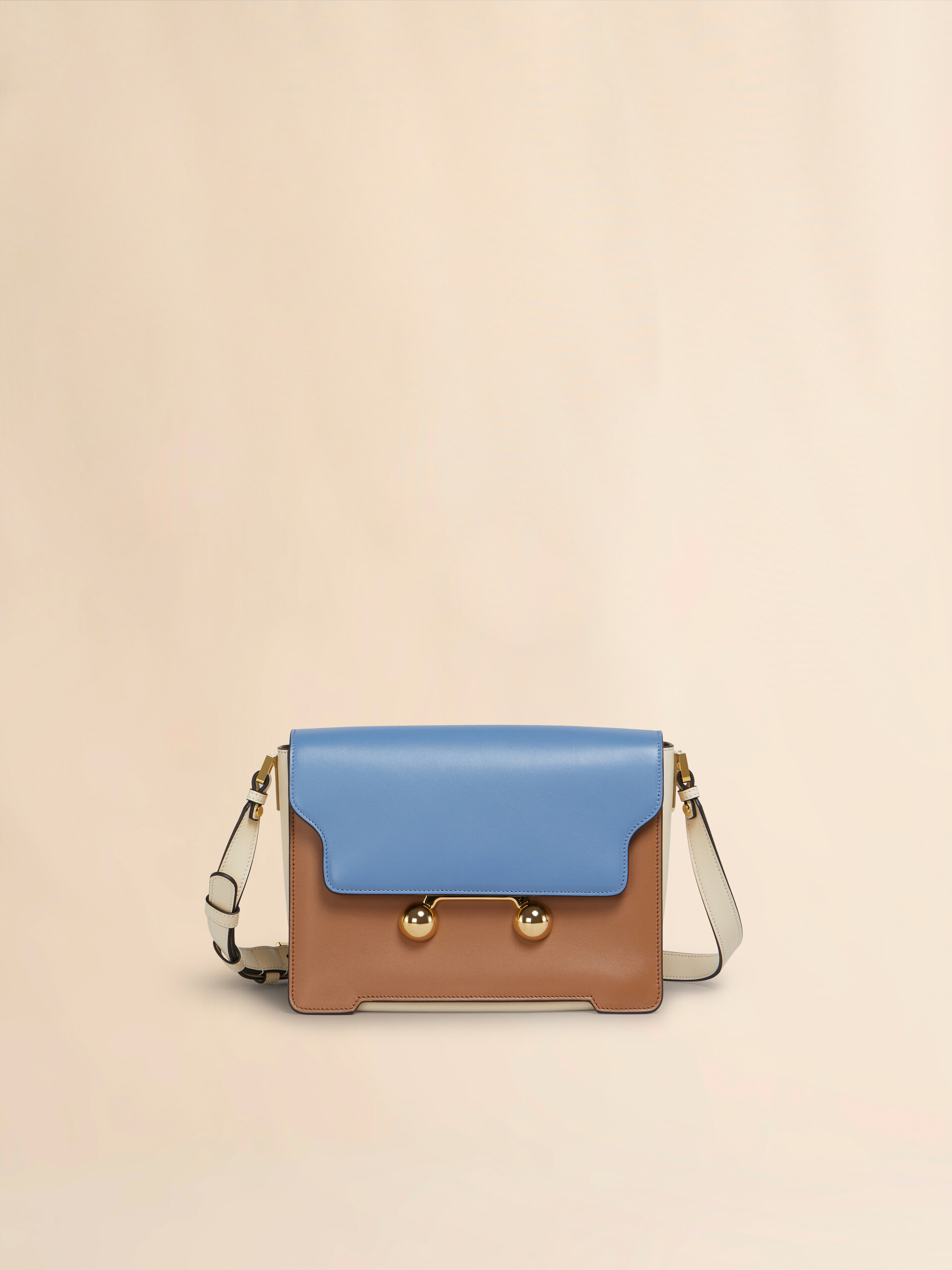 Rechteckige Umhängetasche Trunkaroo aus Kalbsleder. Mittelgroßes Format. Colorblock-Design. Vordere Klappe mit Oversize-Magnetverschluss mit eingraviertem Marni-Schriftzug und zwei deutlich sichtbaren Halbkugeln aus Metall. Geformte Basis auf der Vorder- und Rückseite. Ein Fach mit Innentasche. Mit Nappaleder gefüttert. Schulterriemen mit abnehmbarer und verstellbarer Schnalle: kann auch als Clutch getragen werden. Made in Italy
