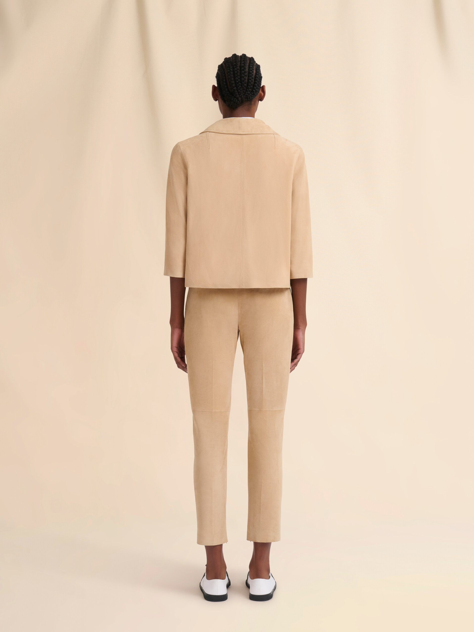 Relaxed-fit boxy jacket made from suede with a remarkably light, silky texture. Single-breasted closure with three buttons. 3/4 sleeves. Three front pockets. Hand-stitched Marni Symbol on the shoulder. Made in Italy