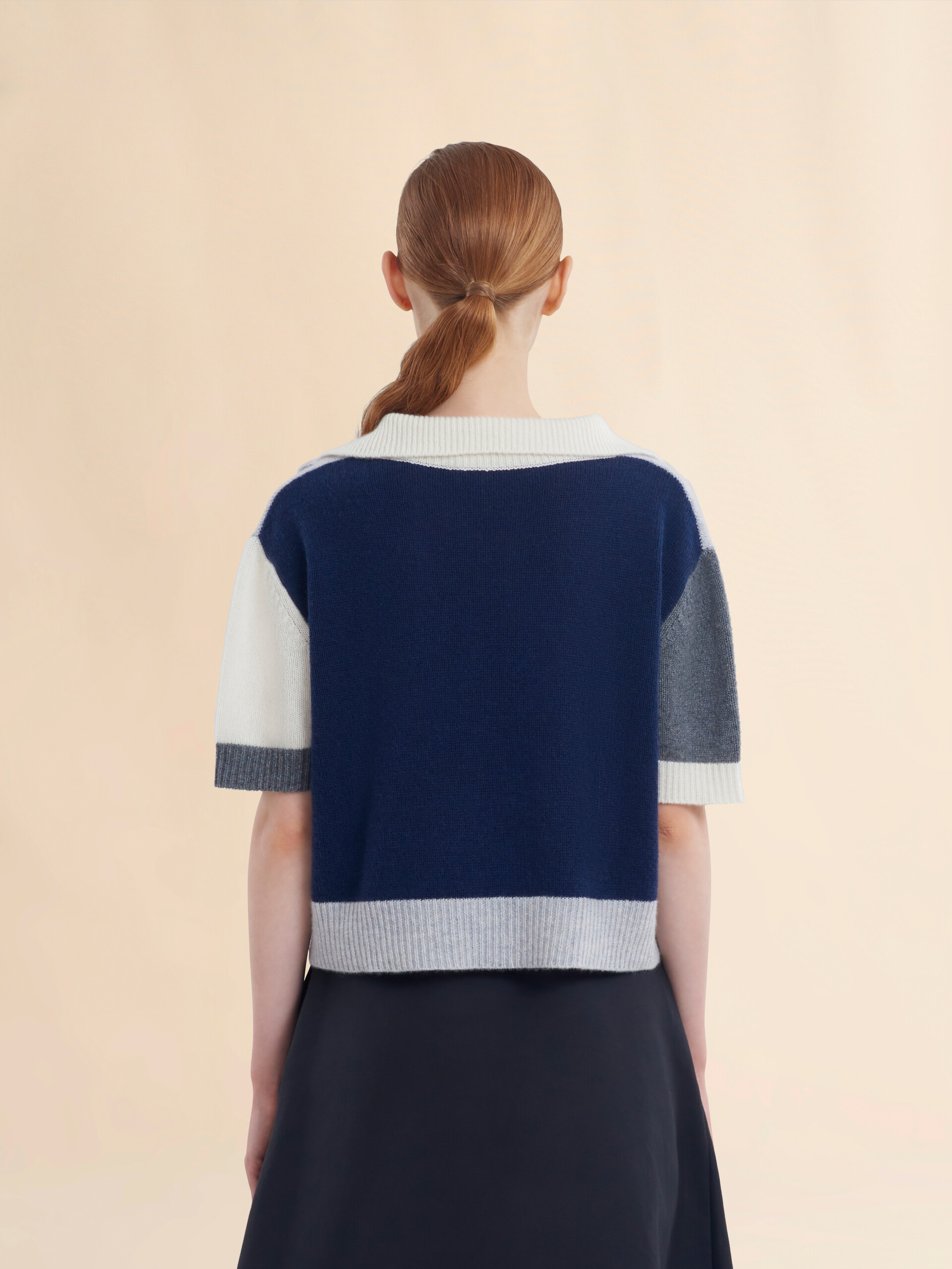 Short sleeved colour block cashmere polo shirt with a boxy silhouette, and V-neck. Ribbed knit trims, and a Marni Symbol hand embroidered on the left shoulder. Made in Italy