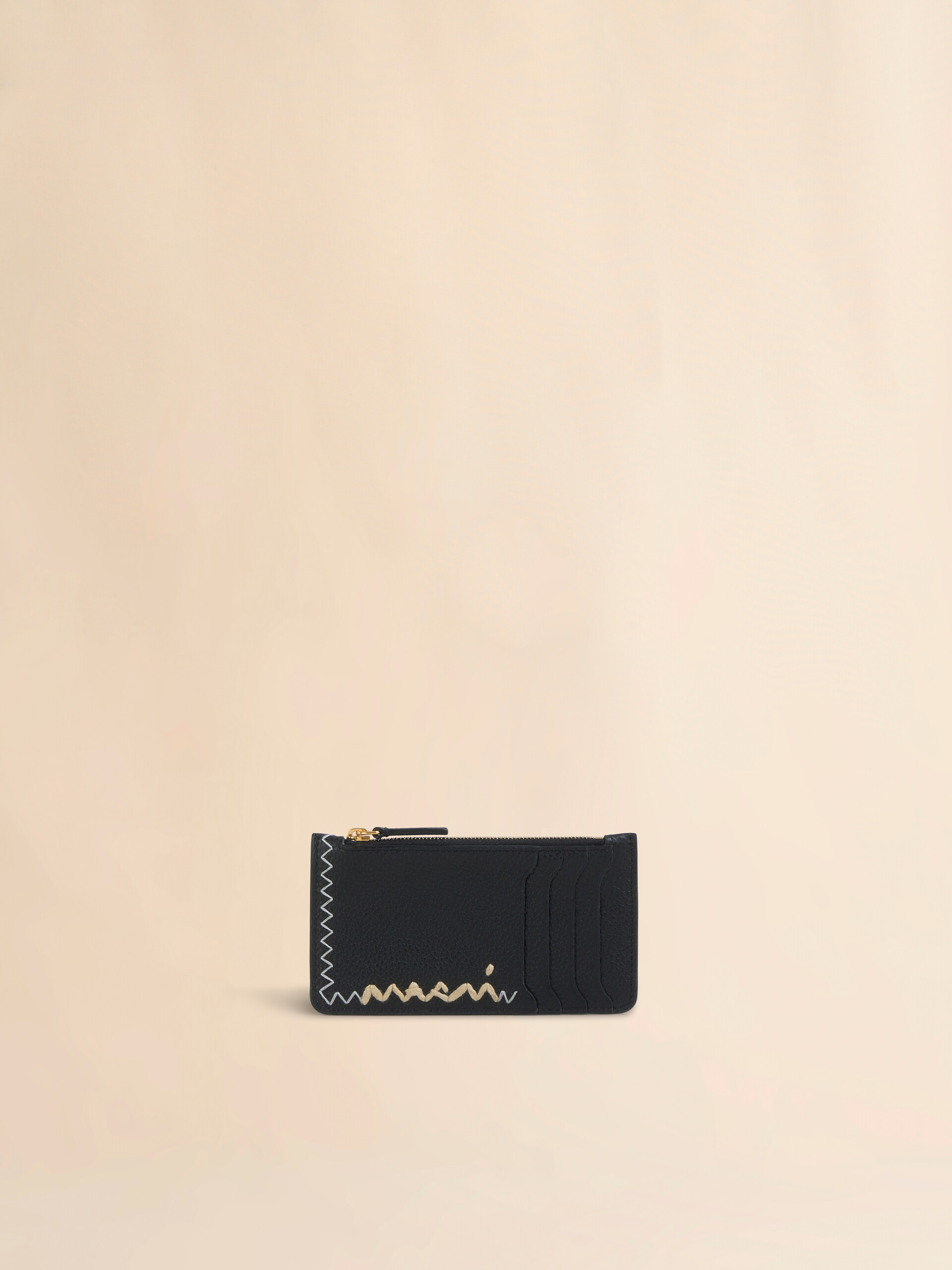 Credit card holder made of tumbled calfskin leather. Four card slots and a central zip compartment. Handmade zigzag stitching and a contrasting Marni Symbol logo on the front.