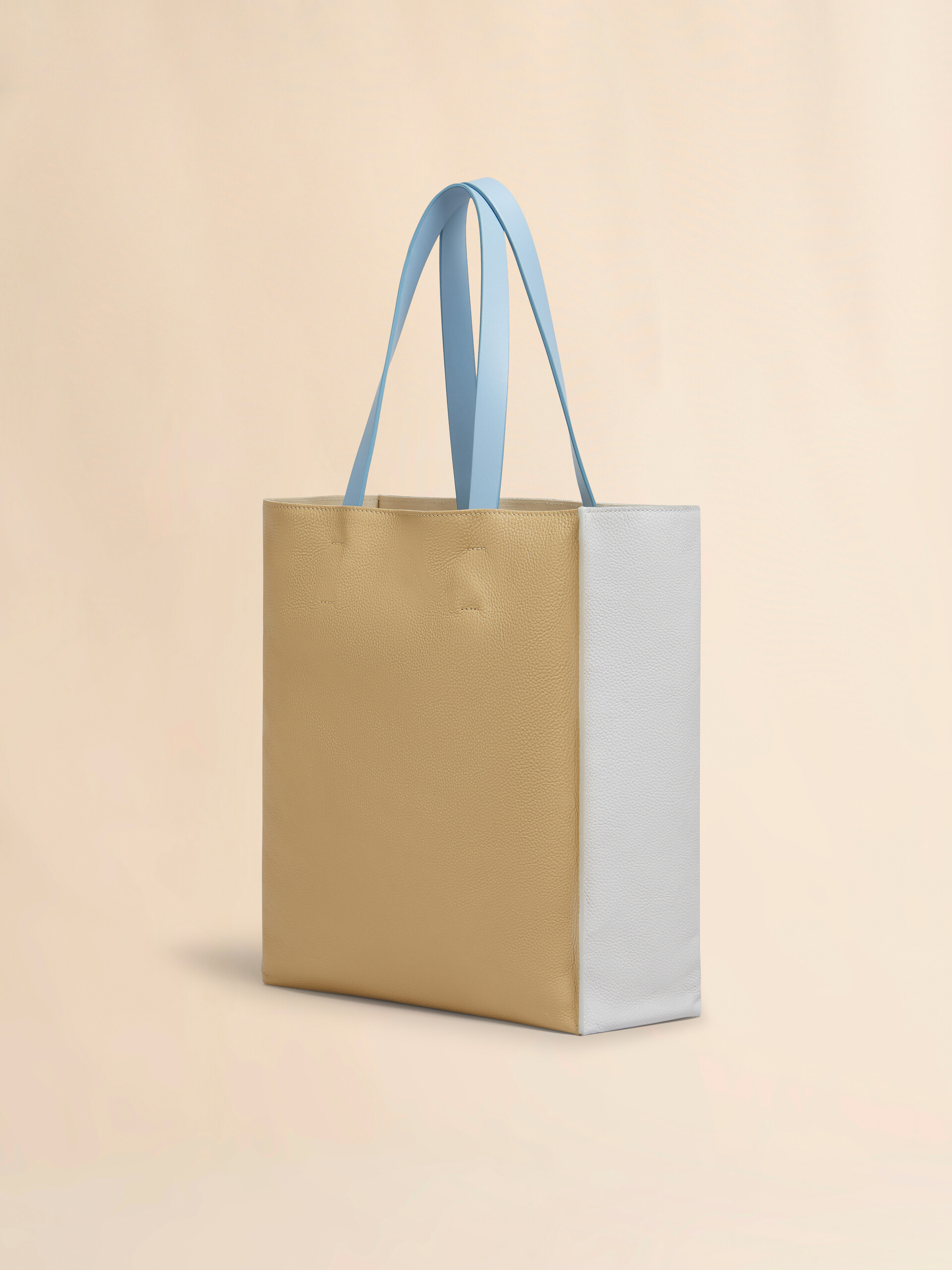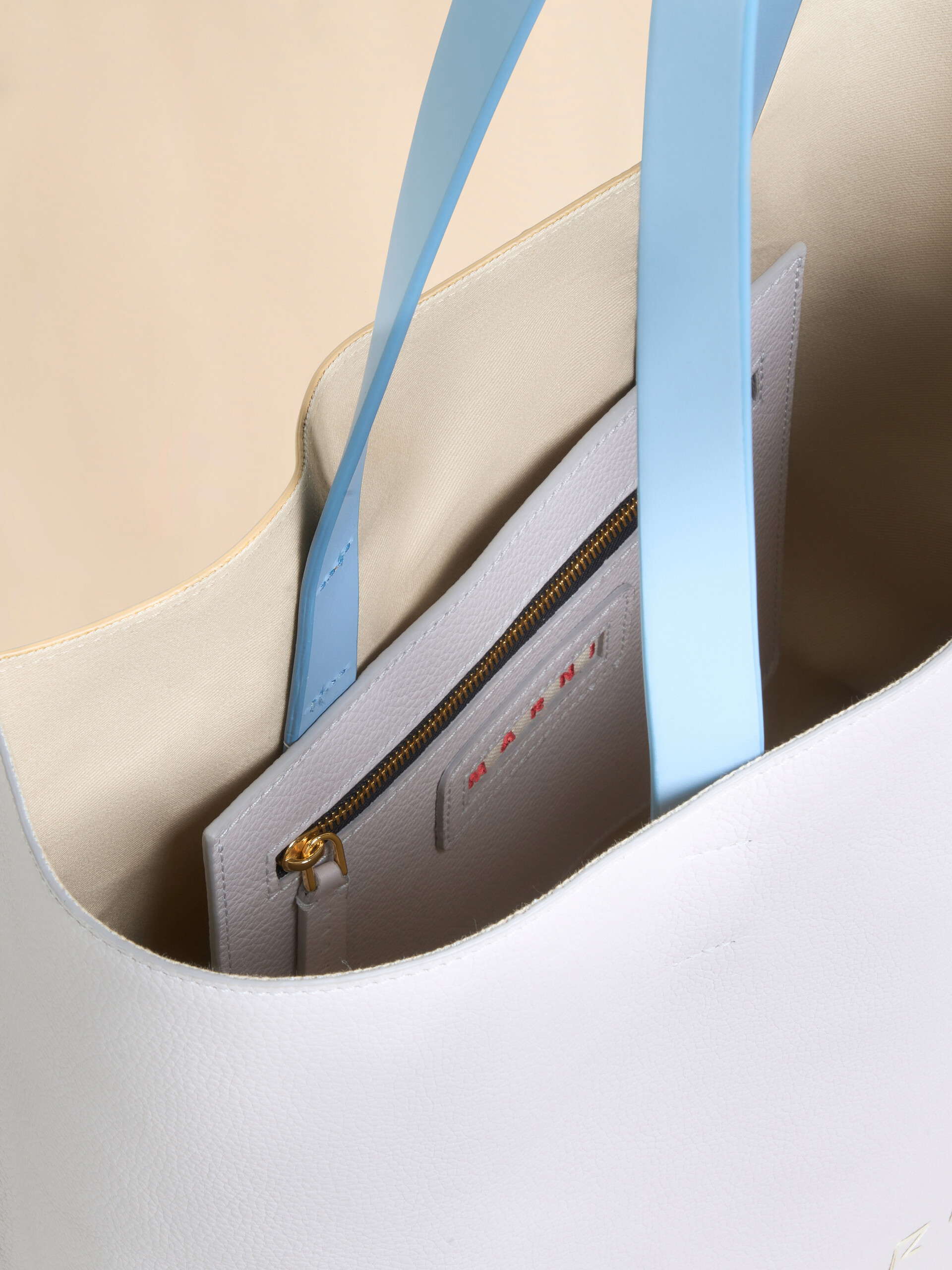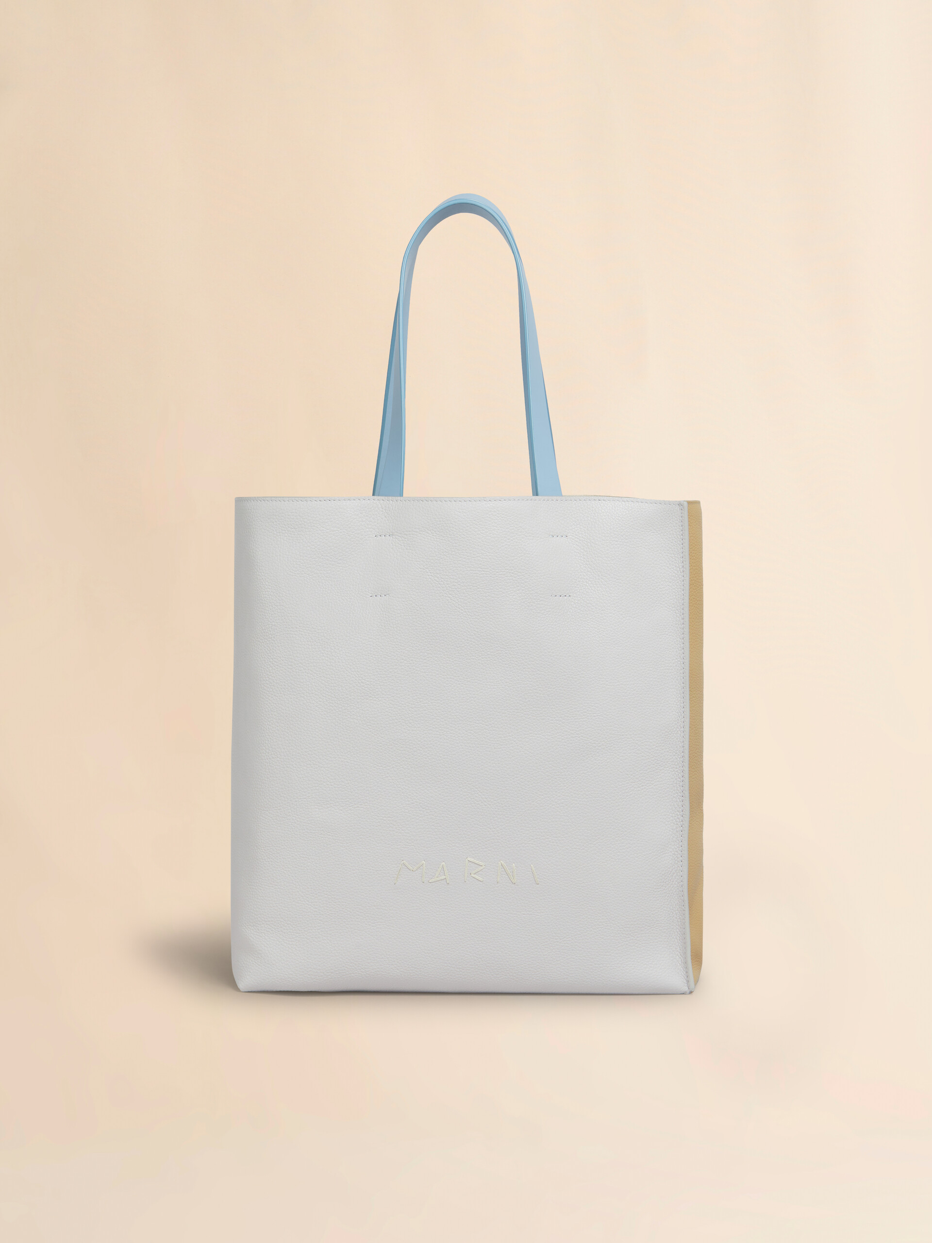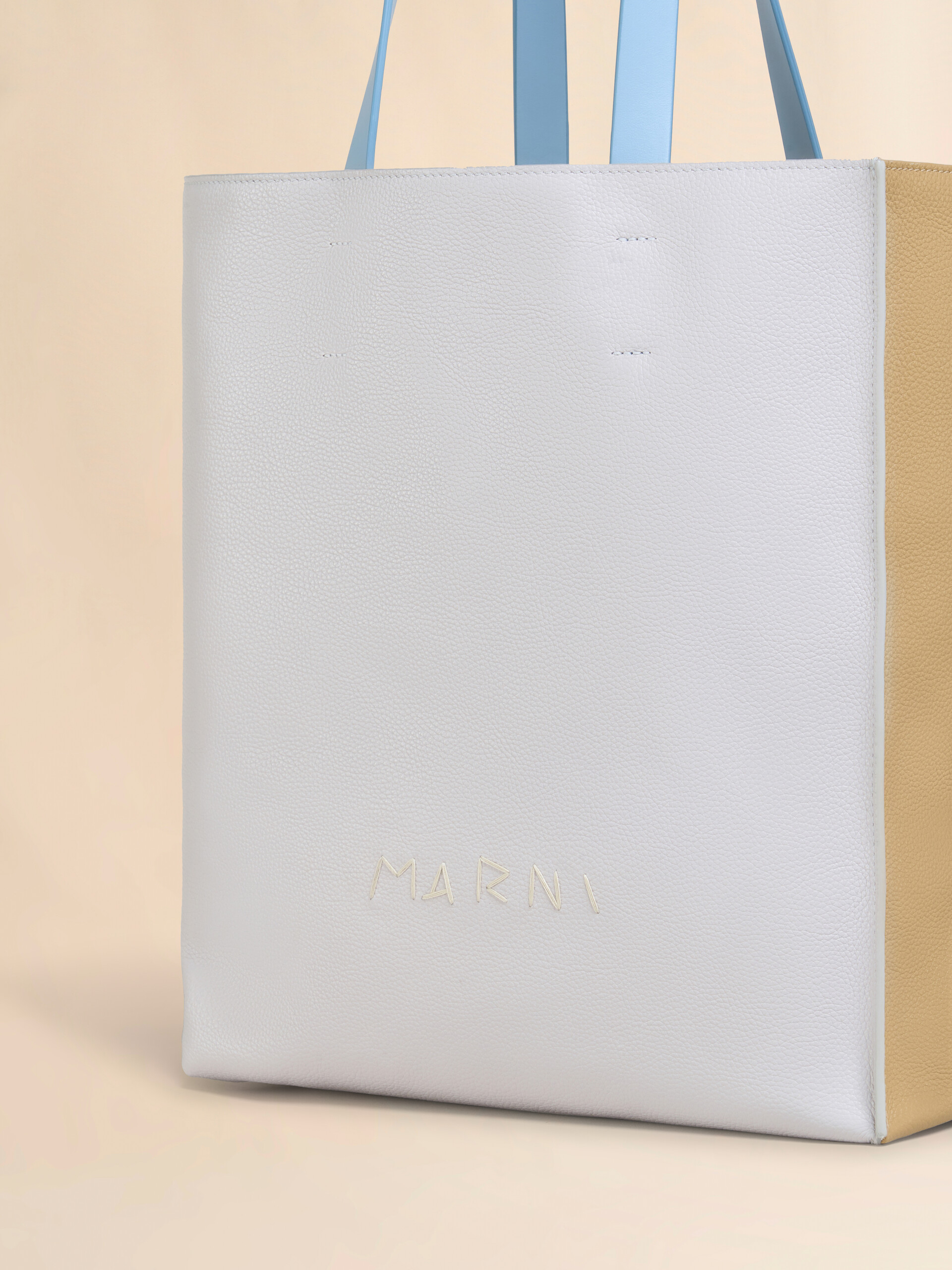Museo Soft North/South shopping bag in calf leather. Large size. Colour block design with contrasting leather handles. Fabric lining and internal zip pocket. Magnetic closure. Hand-embroidered tonal Marni Mending motif on the front.
