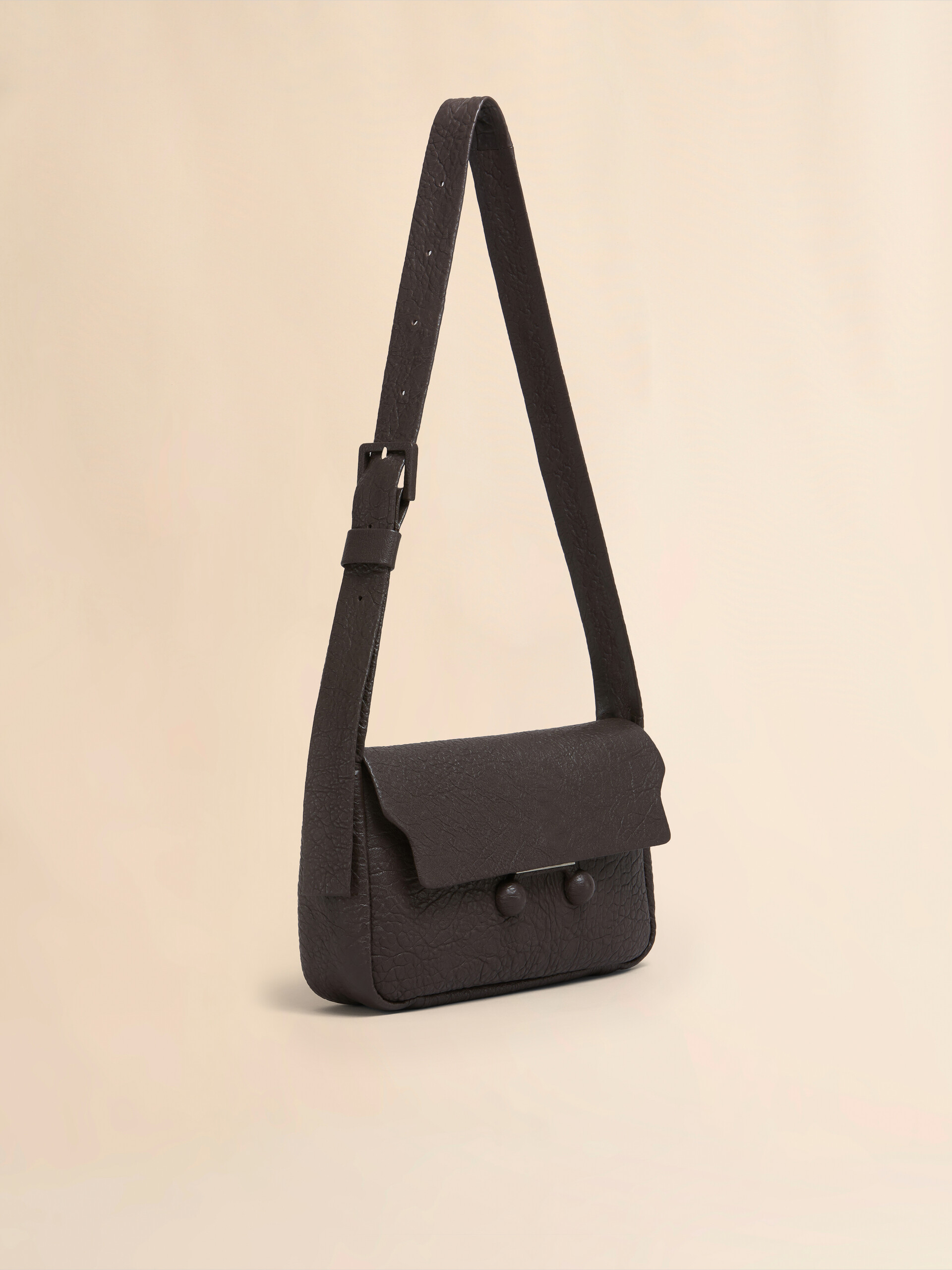 Trunkaroo Soft shoulder bag made of nappa leather with a natural grain. Medium size. The rectangular shape features a front flap closed via a large magnetic clasp engraved with the Marni logo and two half spheres covered in tonal leather. Nappa lining with single pocket. Adjustable leather strap with tonal buckle. Made in Italy