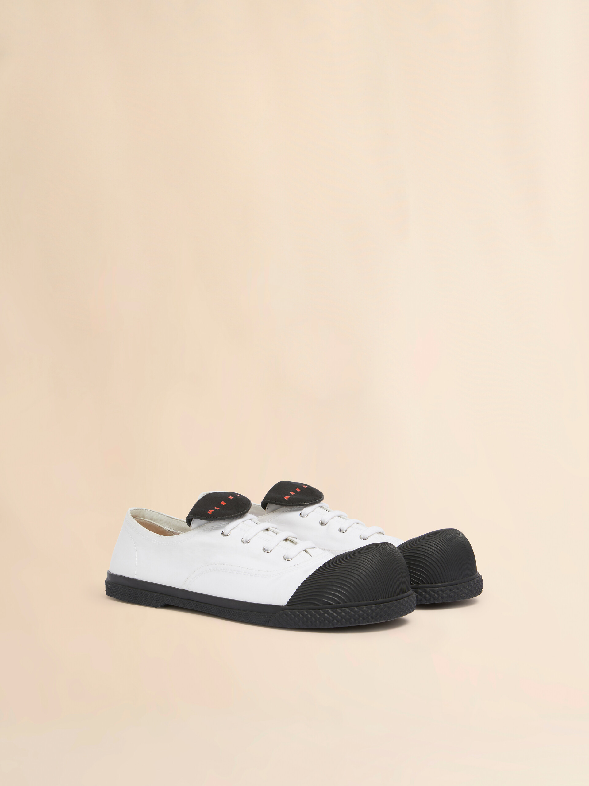 Unisex cotton canvas sneaker with tonal canvas lining for an unlined look. Exaggerated bubble toe with ridged rubber cap. Flexible vulcanised rubber sole. Marni logo on the insole and tongue.