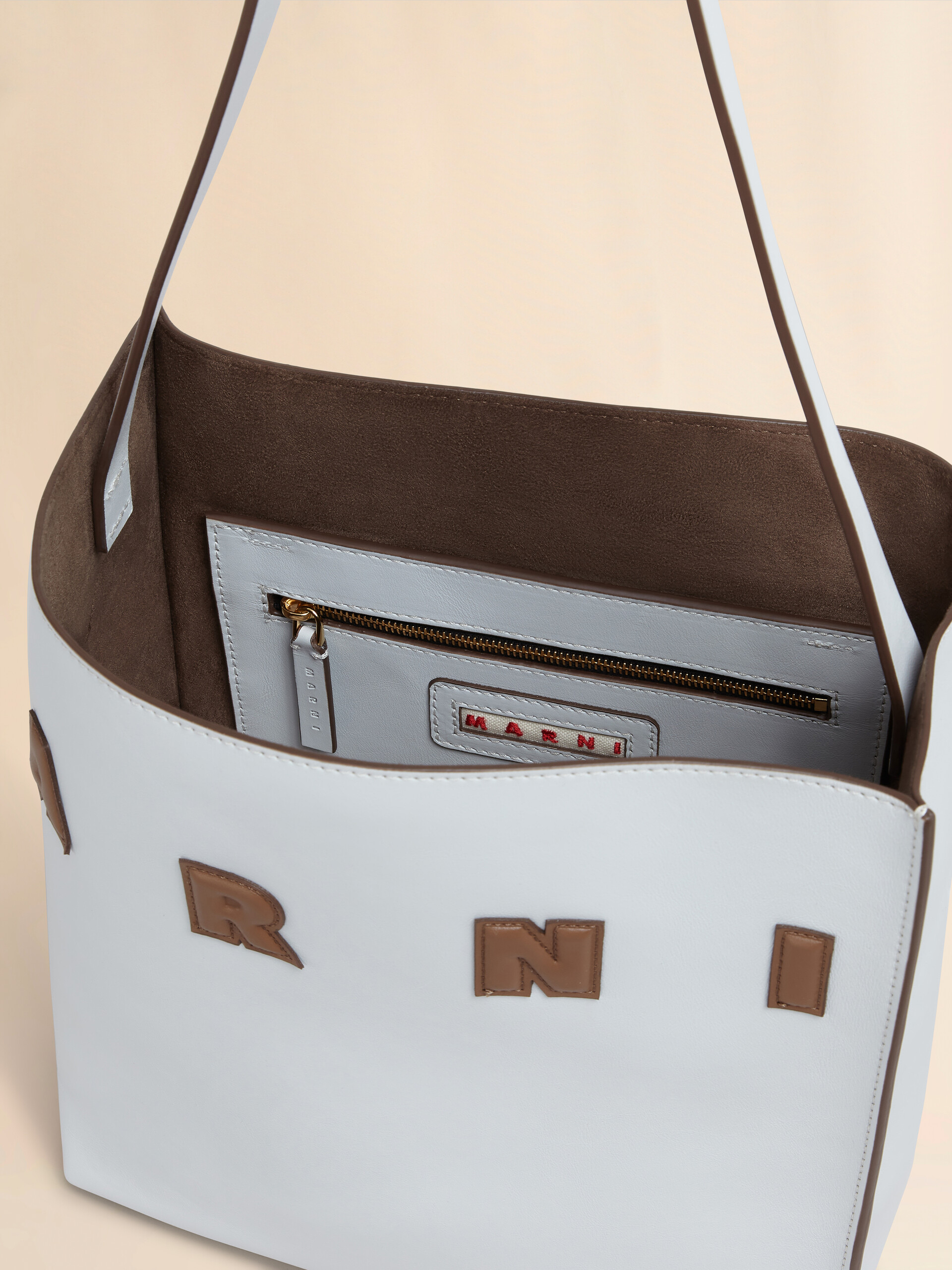 Small light grey leather Museo hobo bag with Marni logo
