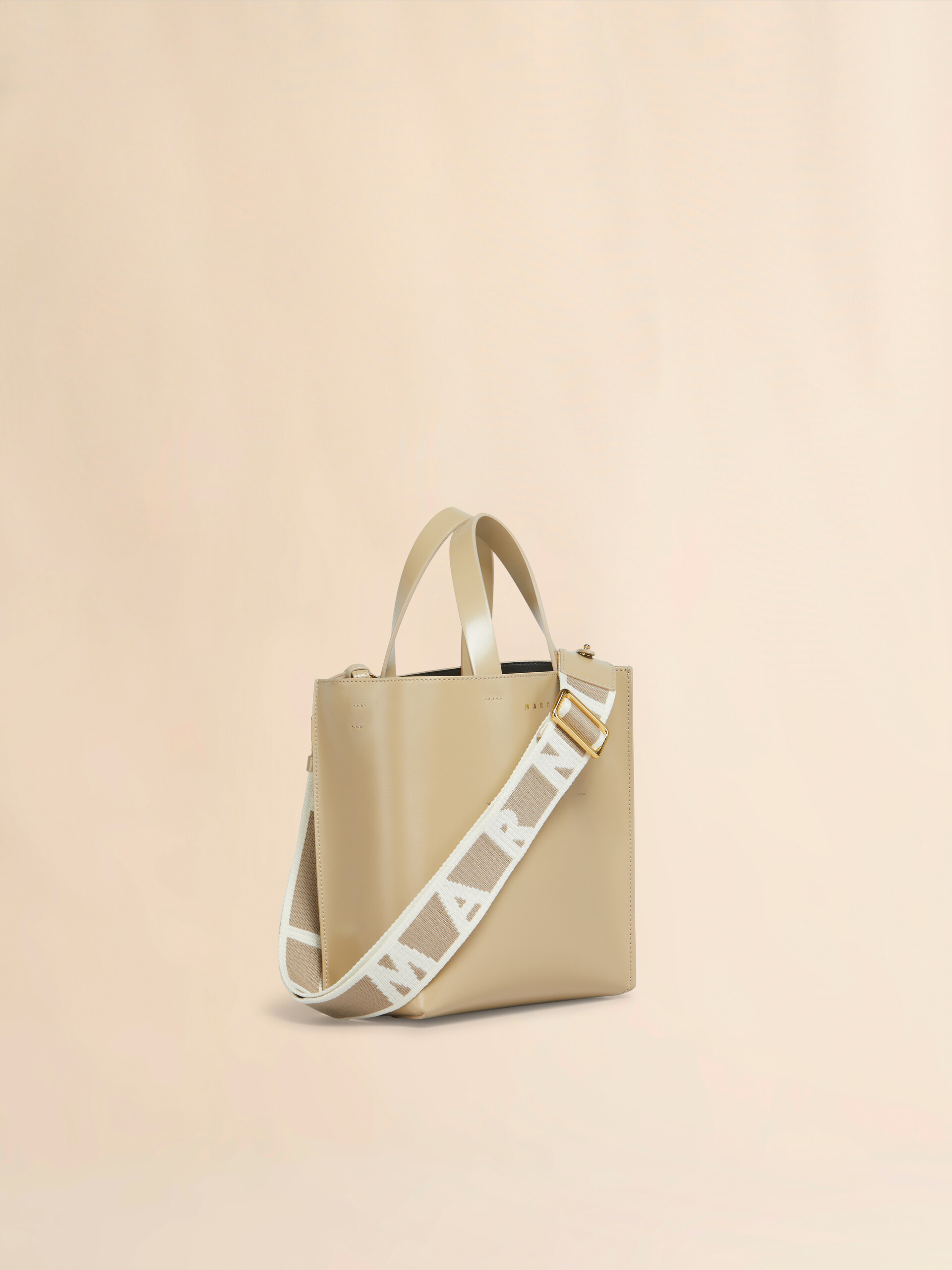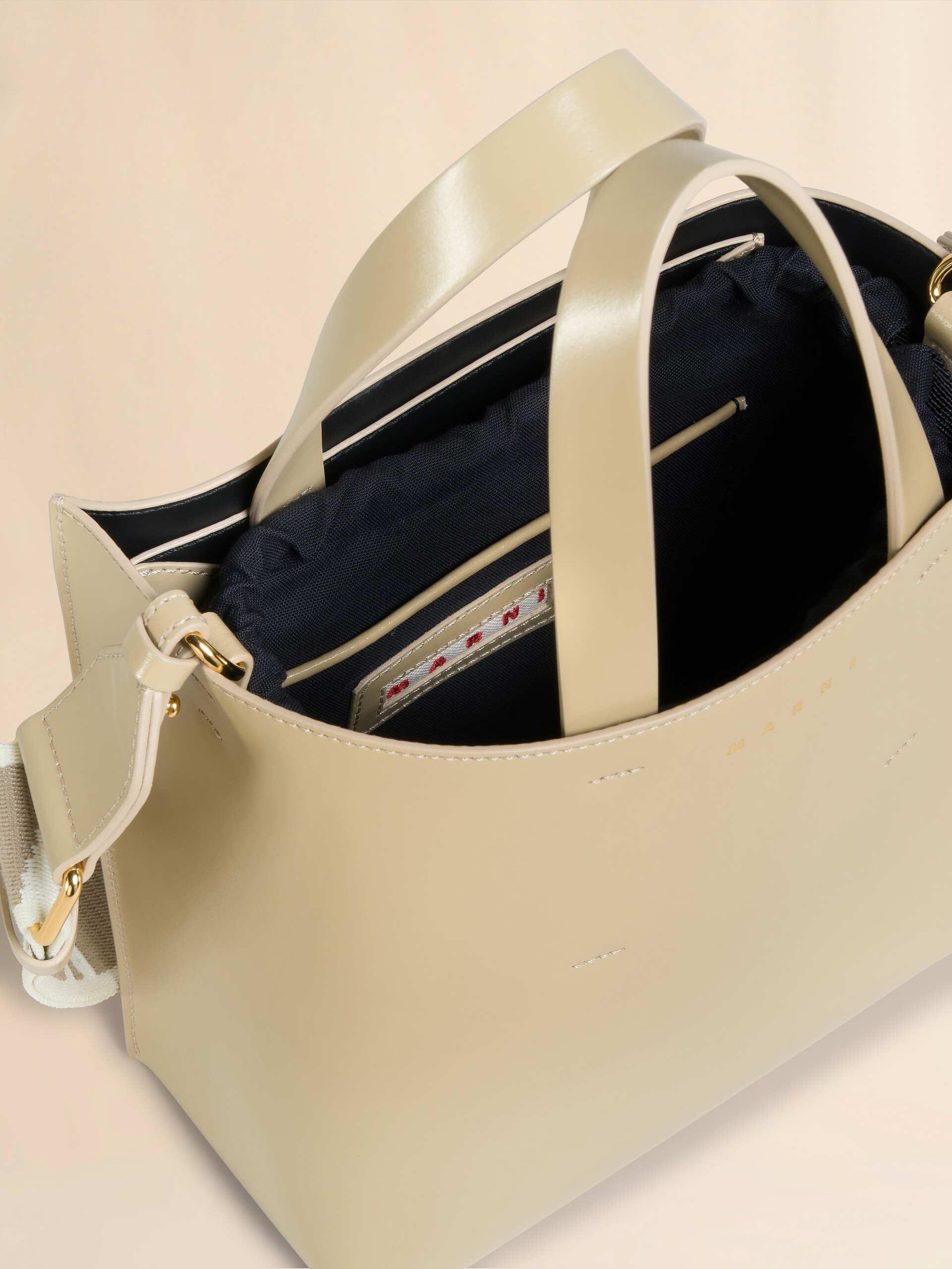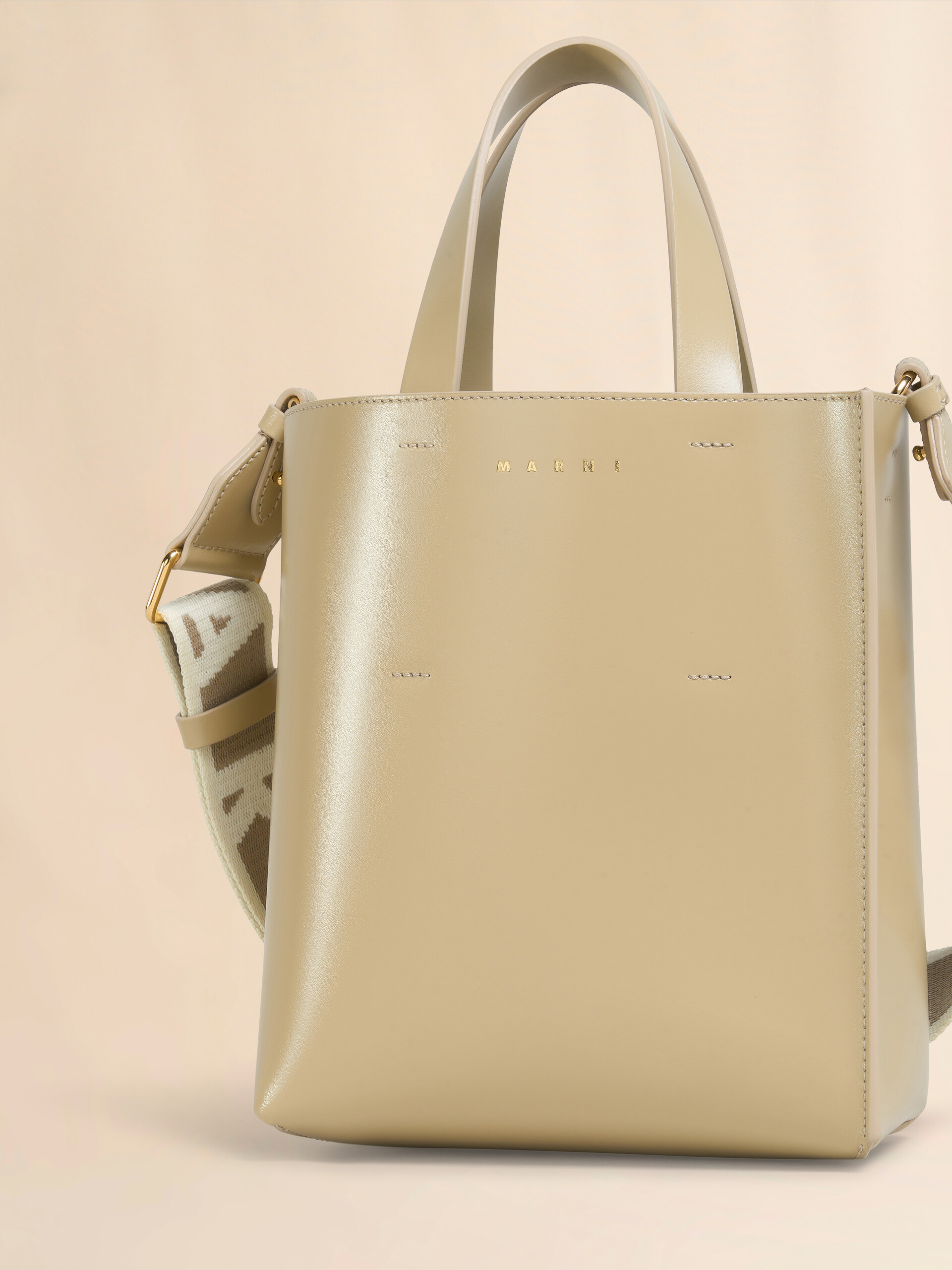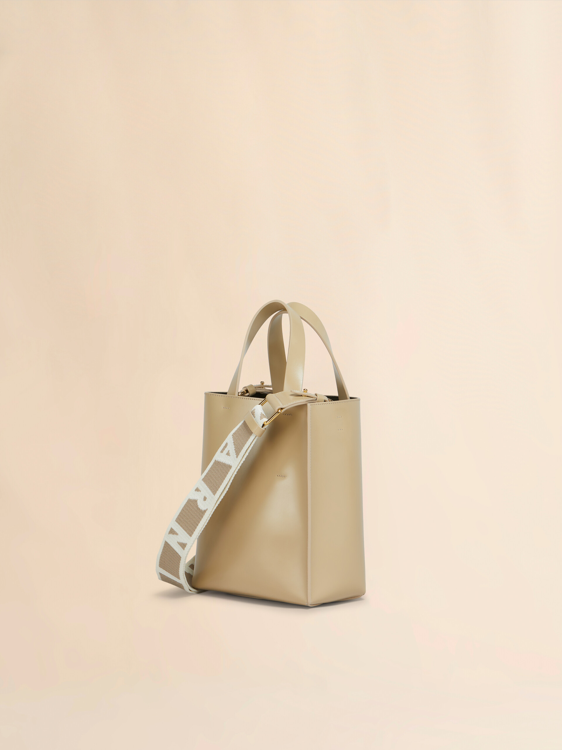 North/South tote bag, mini size, in calf leather with internal slot pocket. Fabric drawstring bag inside. Leather top handles. Detachable and adjustable recycled tape shoulder strap with Marni lettering. Monochromatic design. Gold hardware. Gold printed logo outside. Made in Italy. Made in Italy