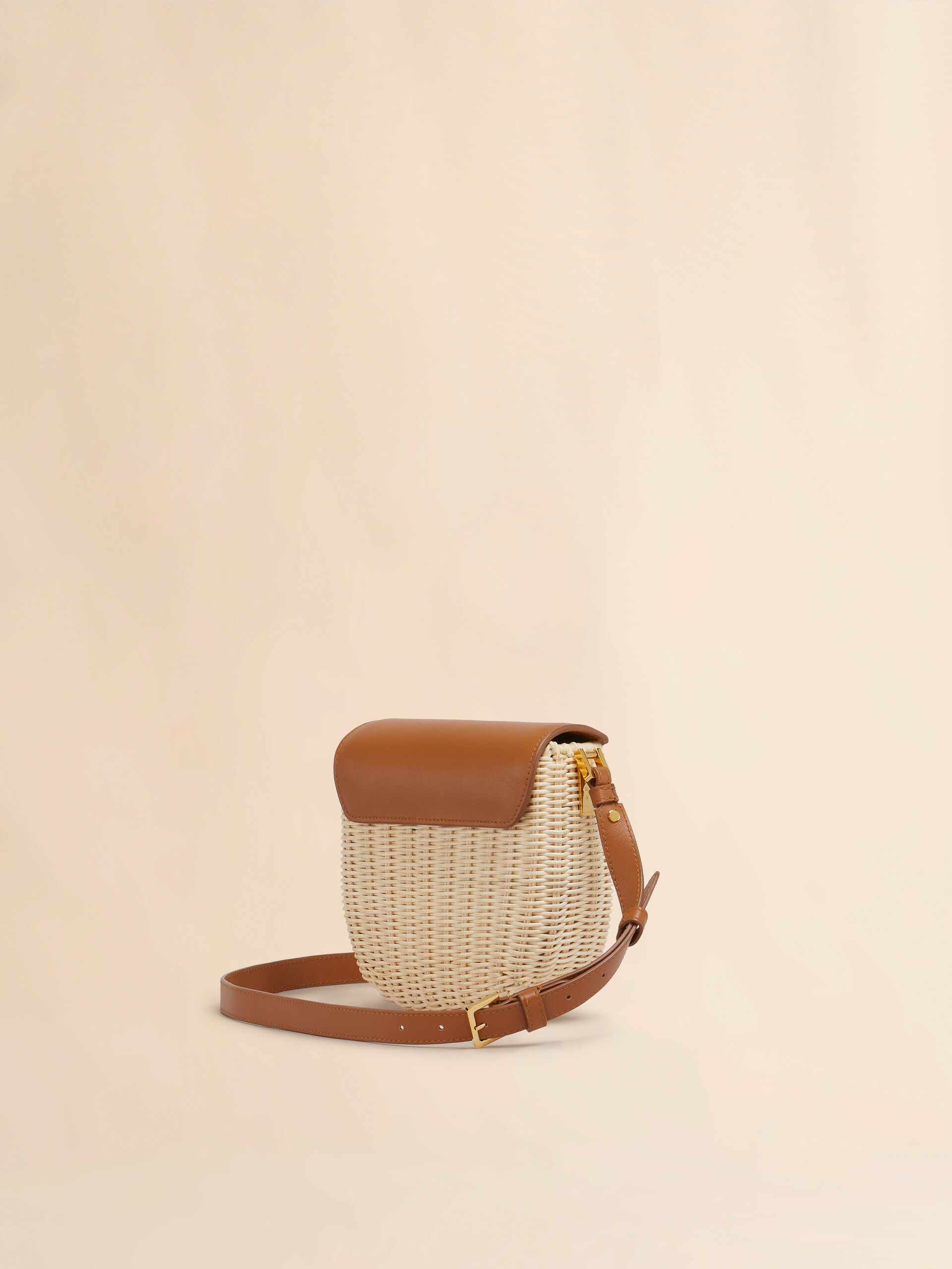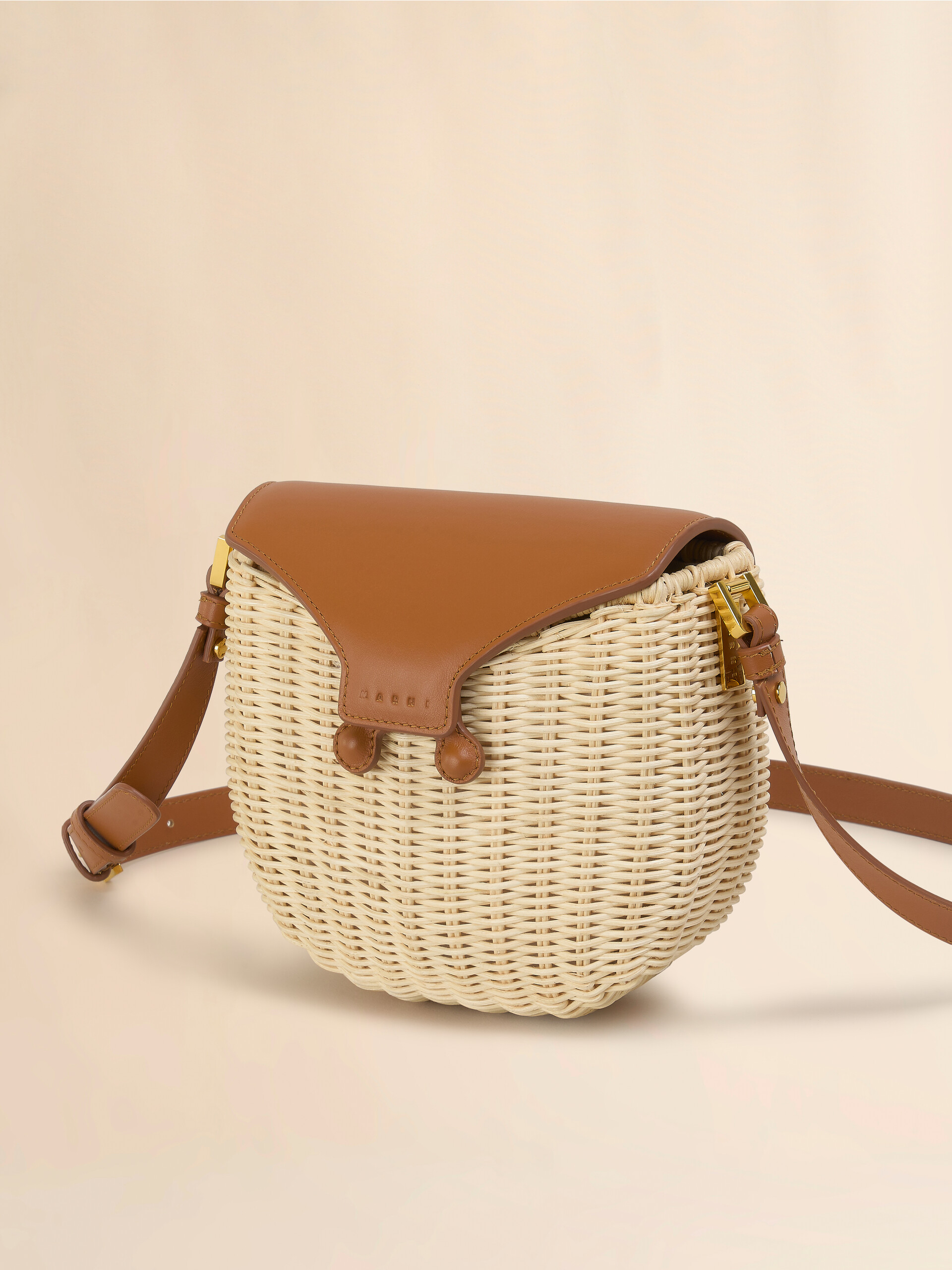 Midollino crossbody bag made from woven rattan with a resistant transparent coating. Rigid basket style with adjustable buckled leather shoulder strap. Leather flap with debossed Marni logo.