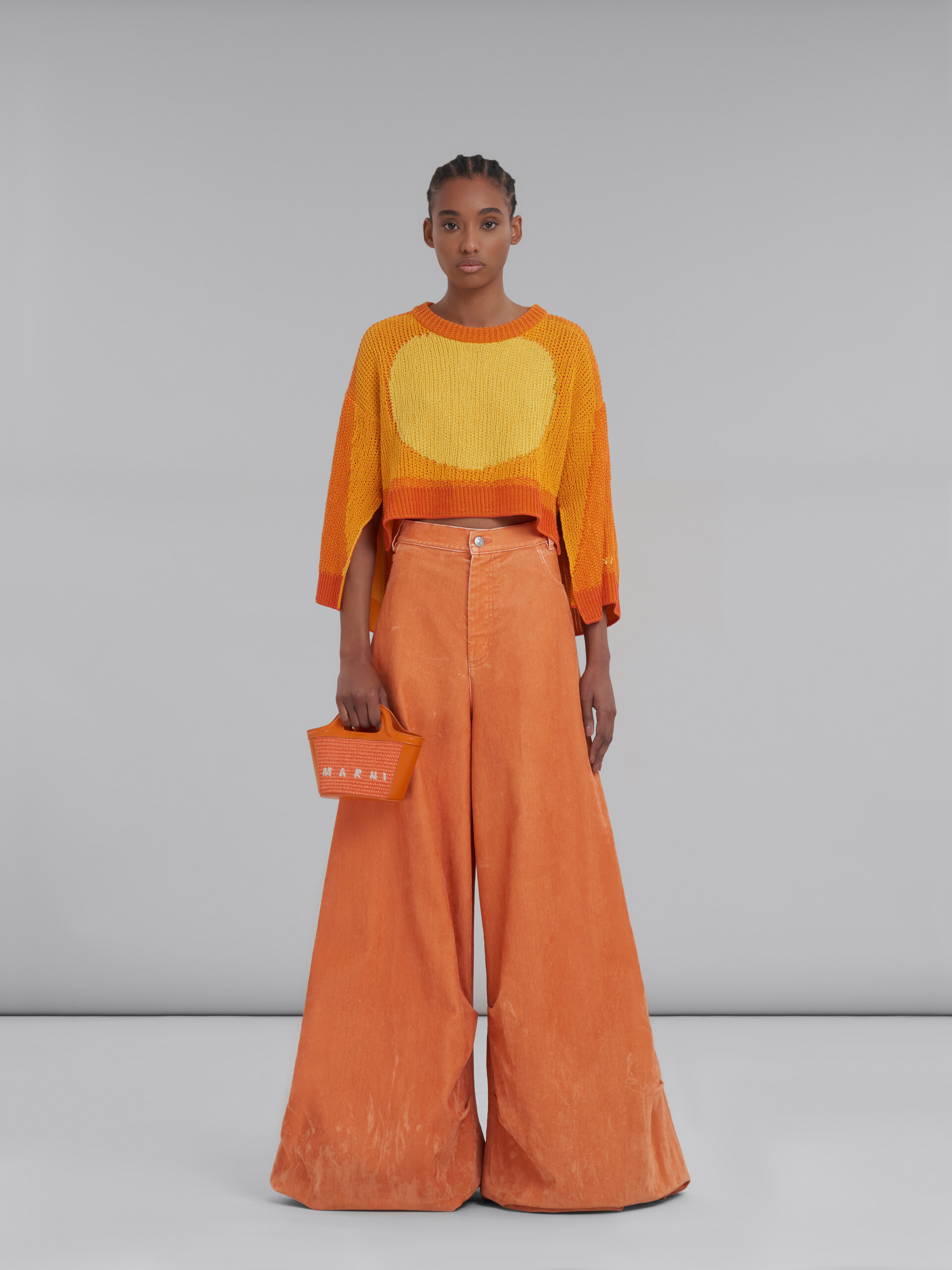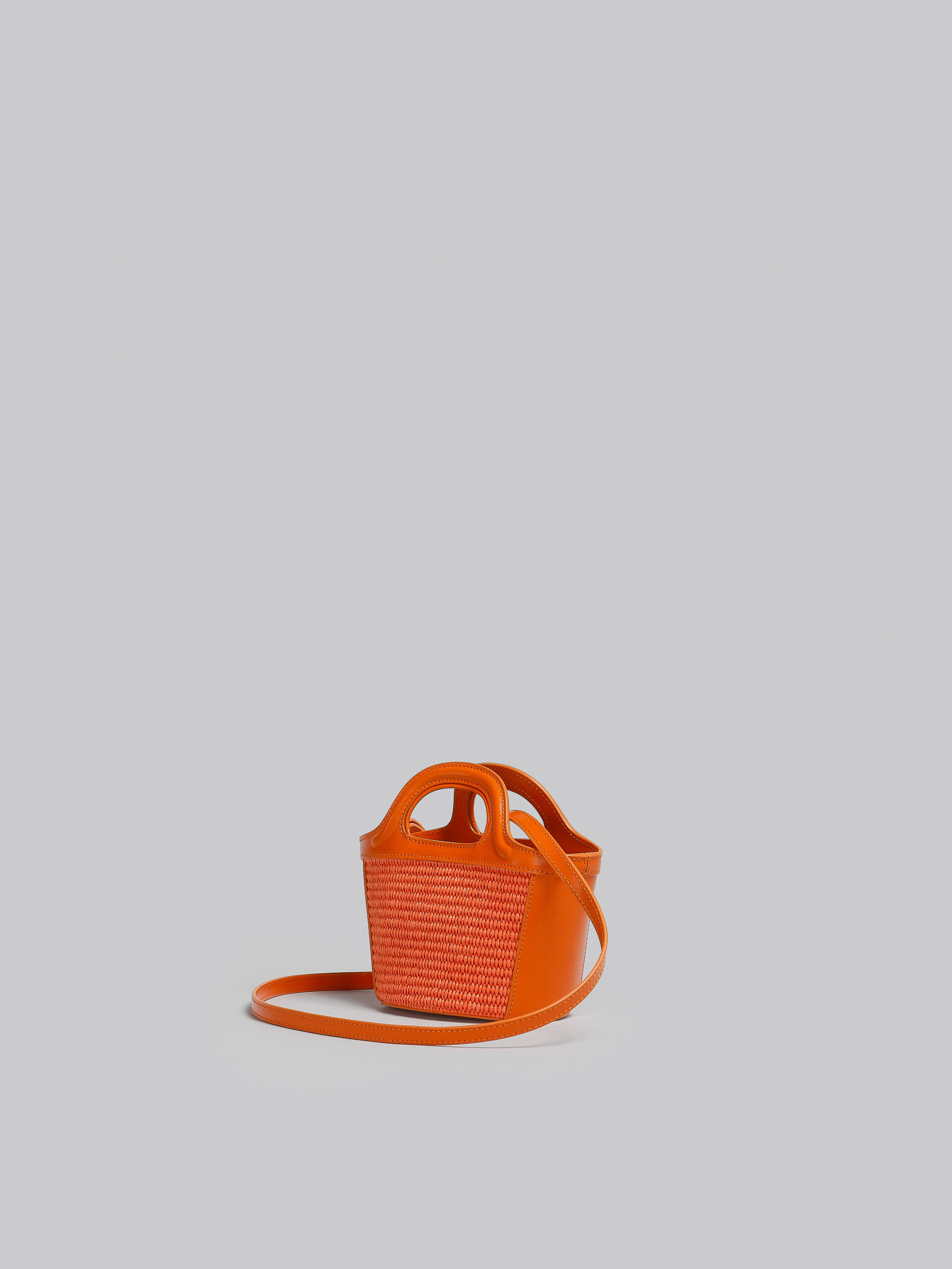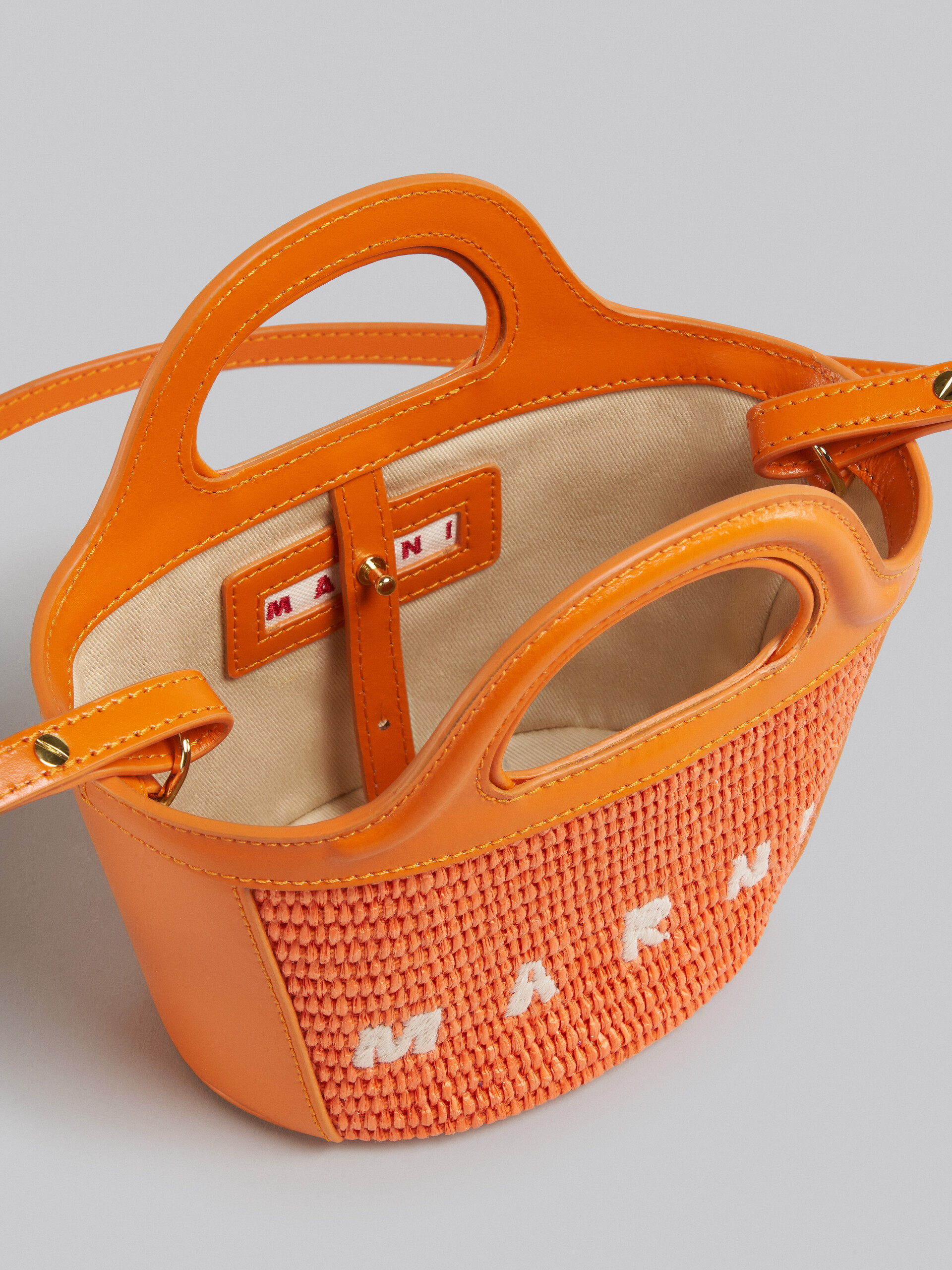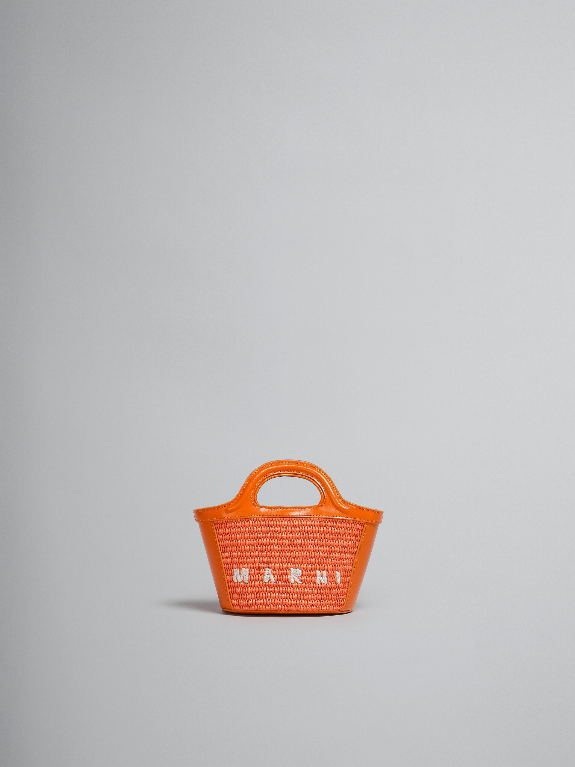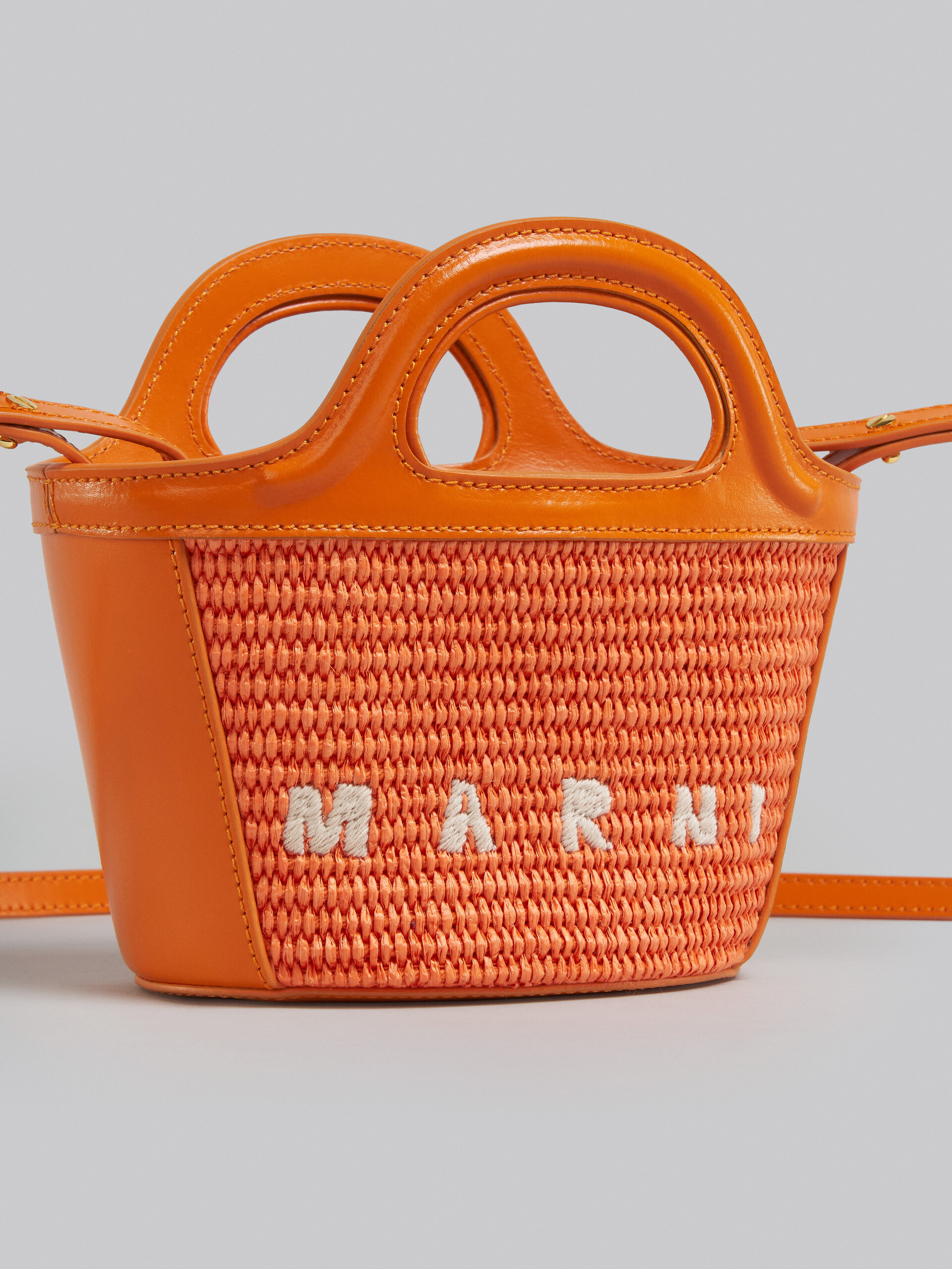 Tropicalia Micro Bag crafted from leather and raffia-effect fabric panels. Can be carried by hand or worn crossbody. Leather closure. Handles with raised effect. Leather bottom and removable shoulder strap. Golden metal details. Embroidered logo on the front. Made in Italy