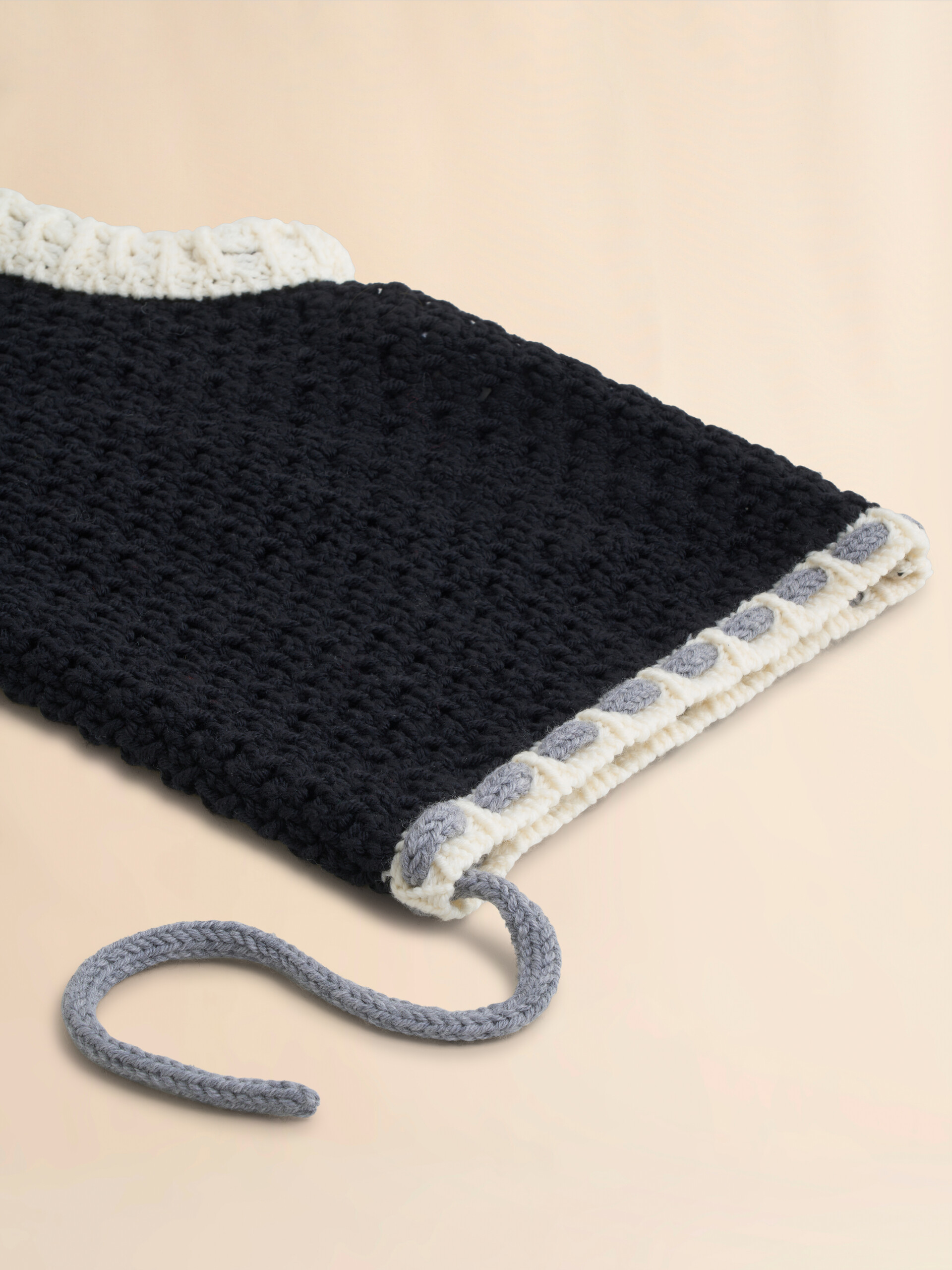 Colour block crochet wool balaclava with contrasting trim and playful donkey ears. Made in Italy