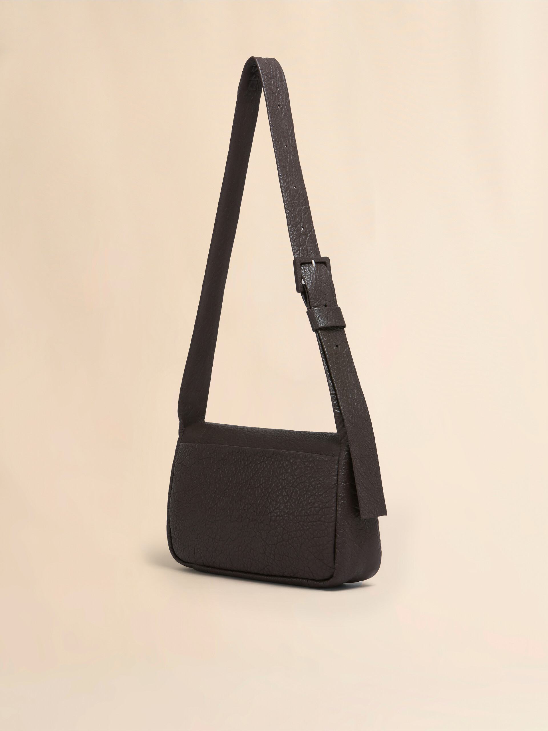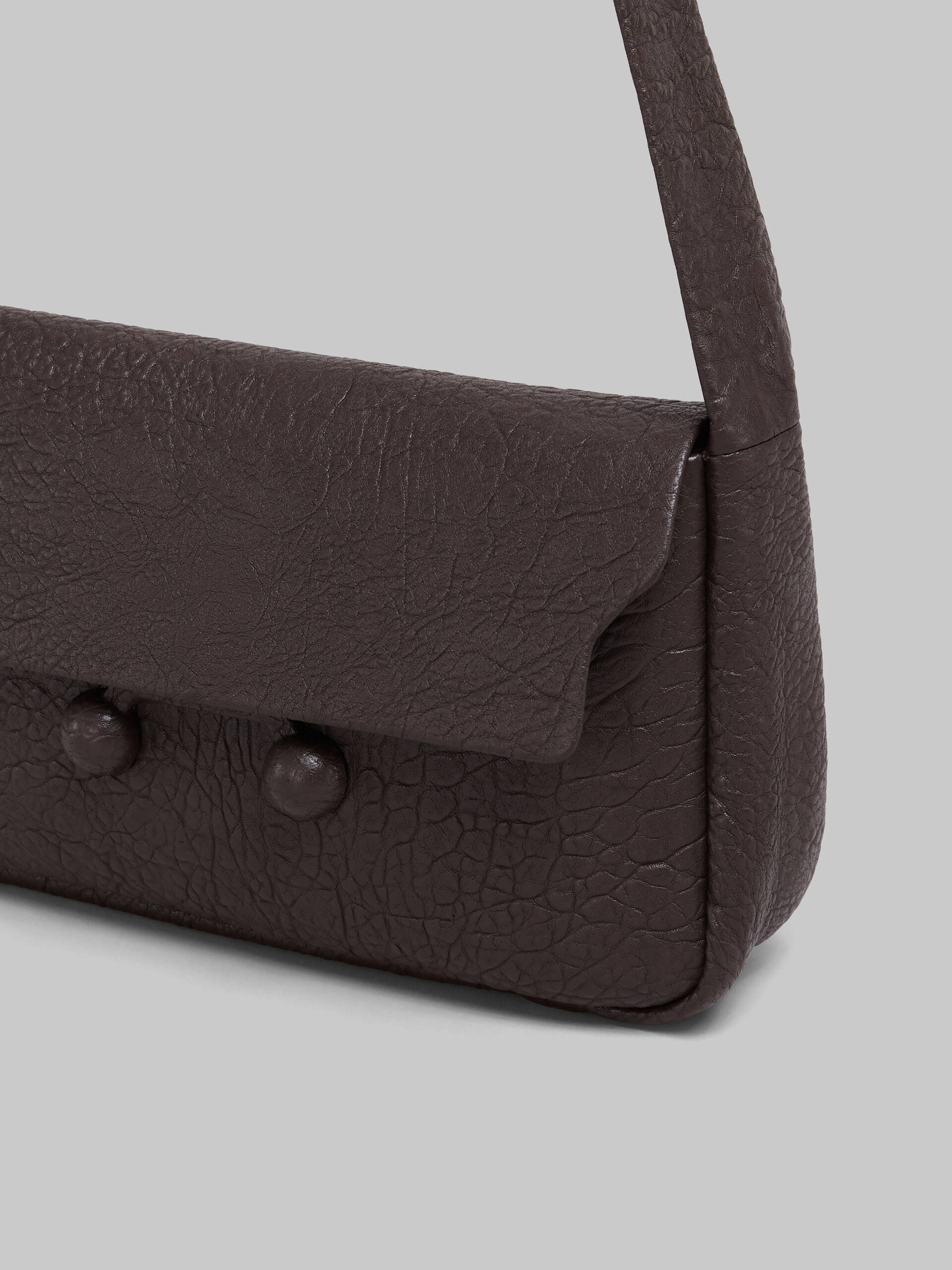 Trunkaroo Soft shoulder bag made of nappa leather with a natural grain. Medium size. The rectangular shape features a front flap closed via a large magnetic clasp engraved with the Marni logo and two half spheres covered in tonal leather. Nappa lining with single pocket. Adjustable leather strap with tonal buckle. Made in Italy