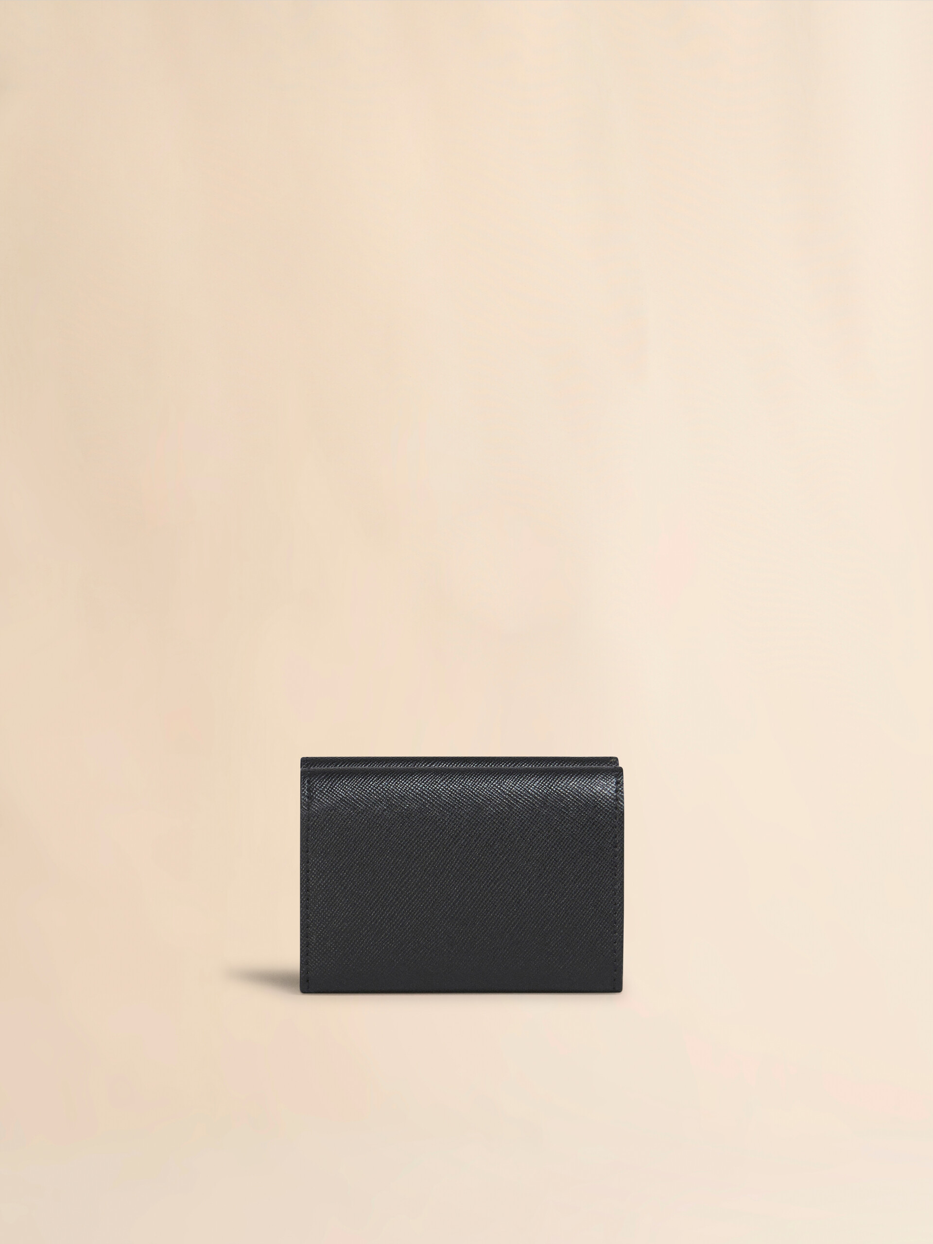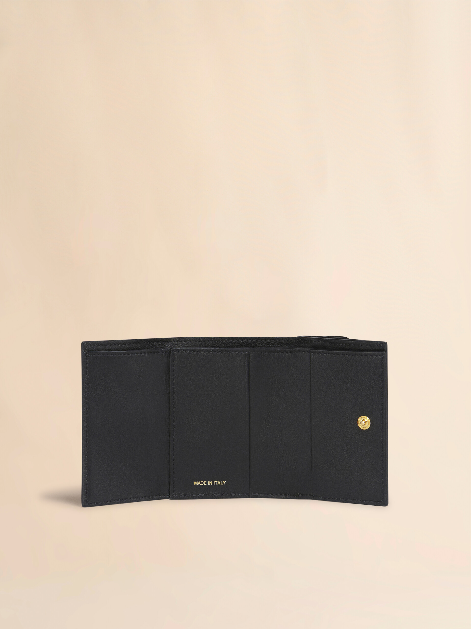 Saffiano leather tri-fold wallet; snap-secured. 1 note compartment; 1 credit card case; 1 coin pocket. Gold hardware. Gold printed logo. . Made in Italy