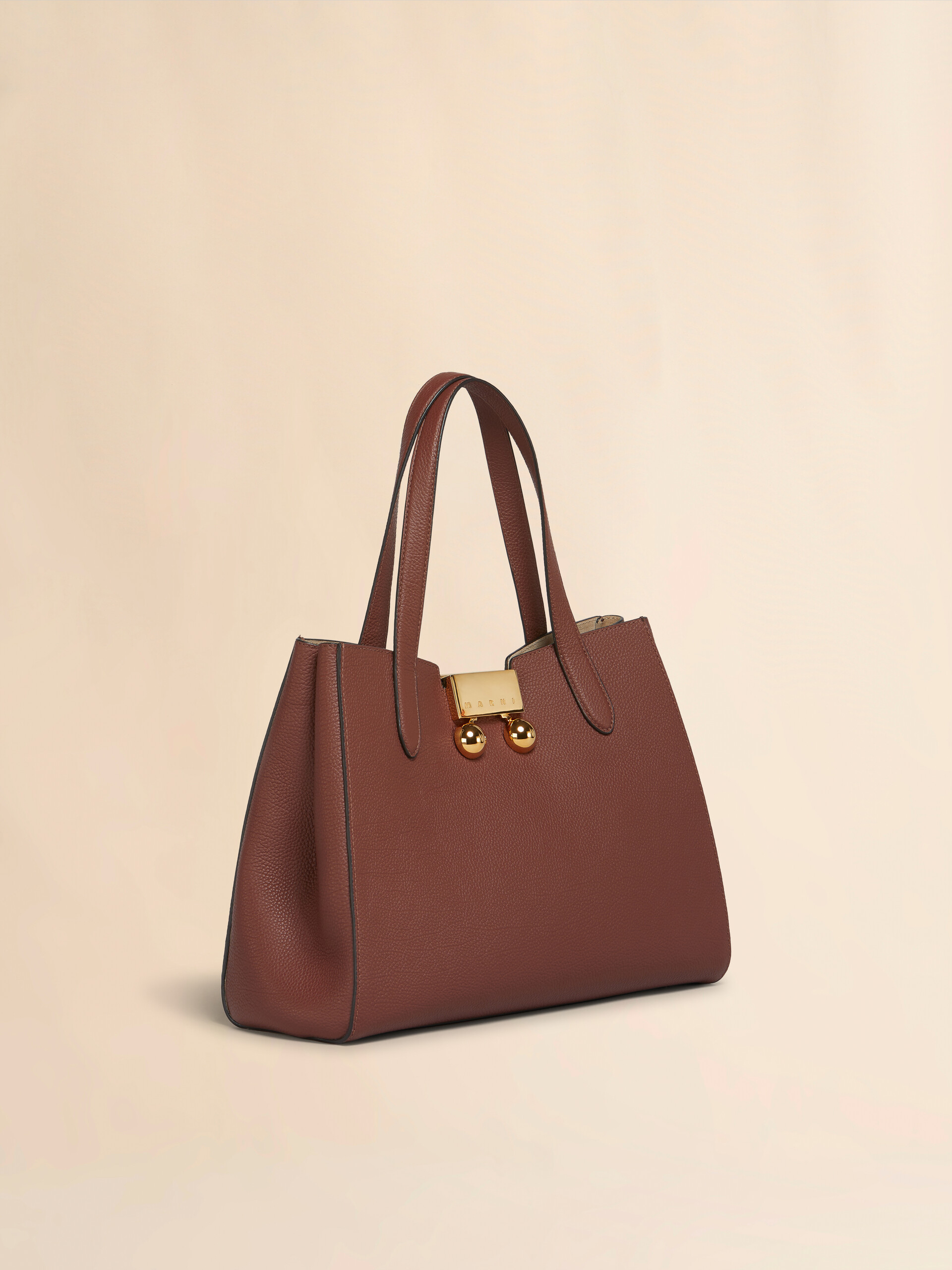 Trunkaroo Tote bag made of pebbled calf leather. Small size. Double handle and adjustable, removable leather shoulder strap. Oversized magnetic closure featuring engraved Marni lettering and two visually impactful metal stud details. Accordion-style design with suede interior and central zip pocket. Gold hardware.