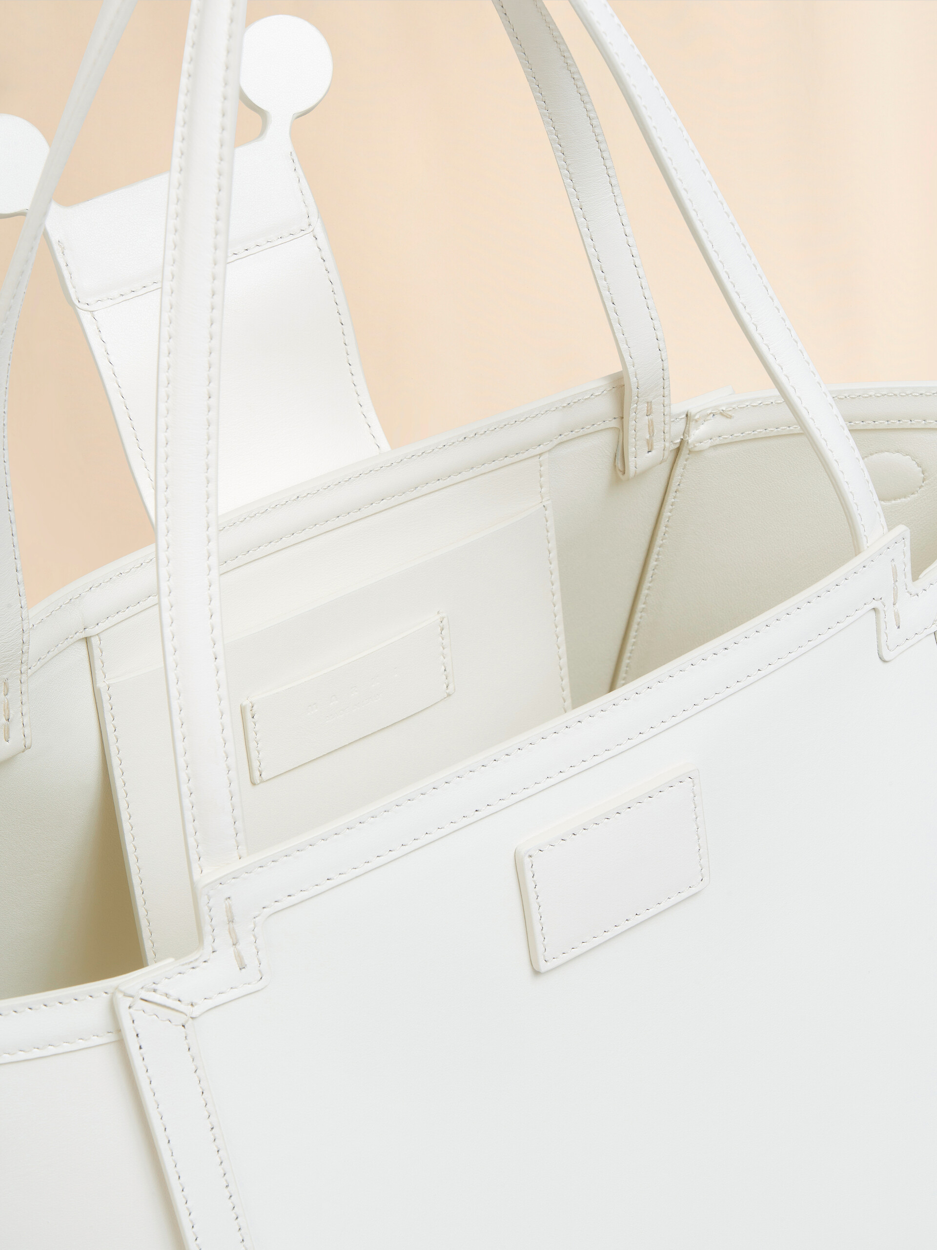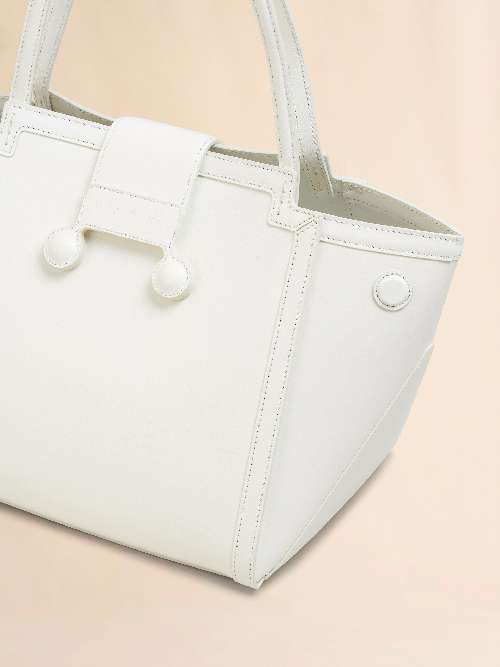 Mini Riviera bag made of smooth calf leather. Trapeze-shape with magnetic buttons on the sides. Leather trims and handles for hand or shoulder carry. Unlined interior with flat pocket. Magnetic leather closure with Marni lettering and two metal stud details.