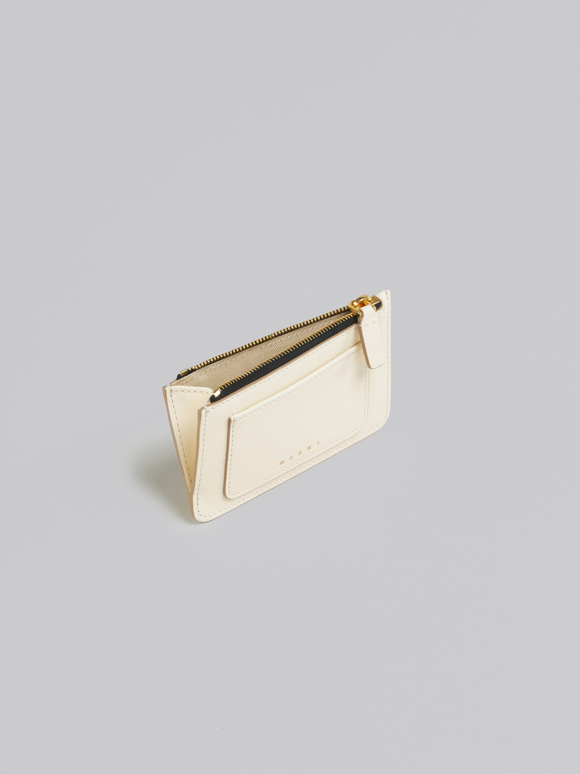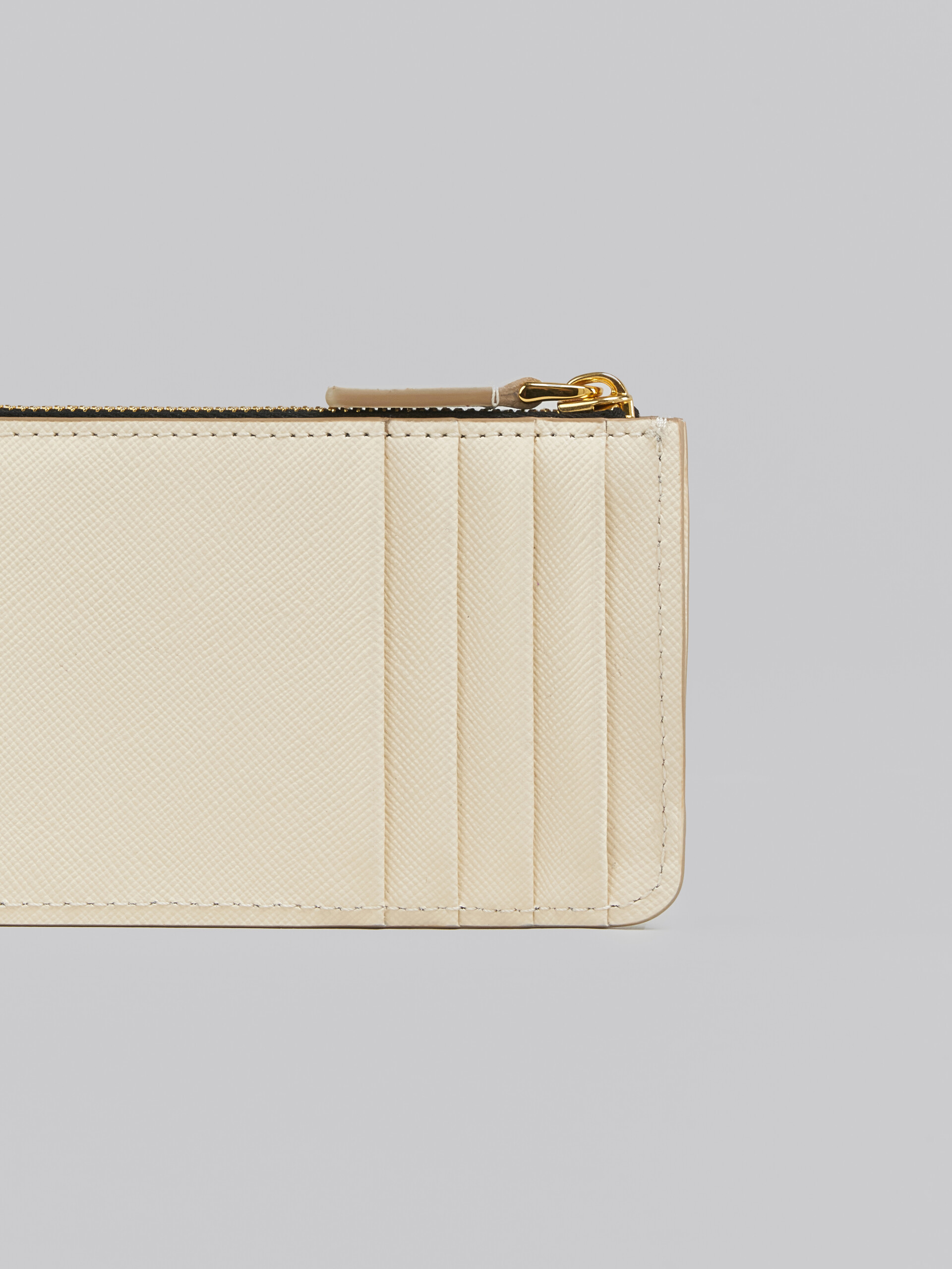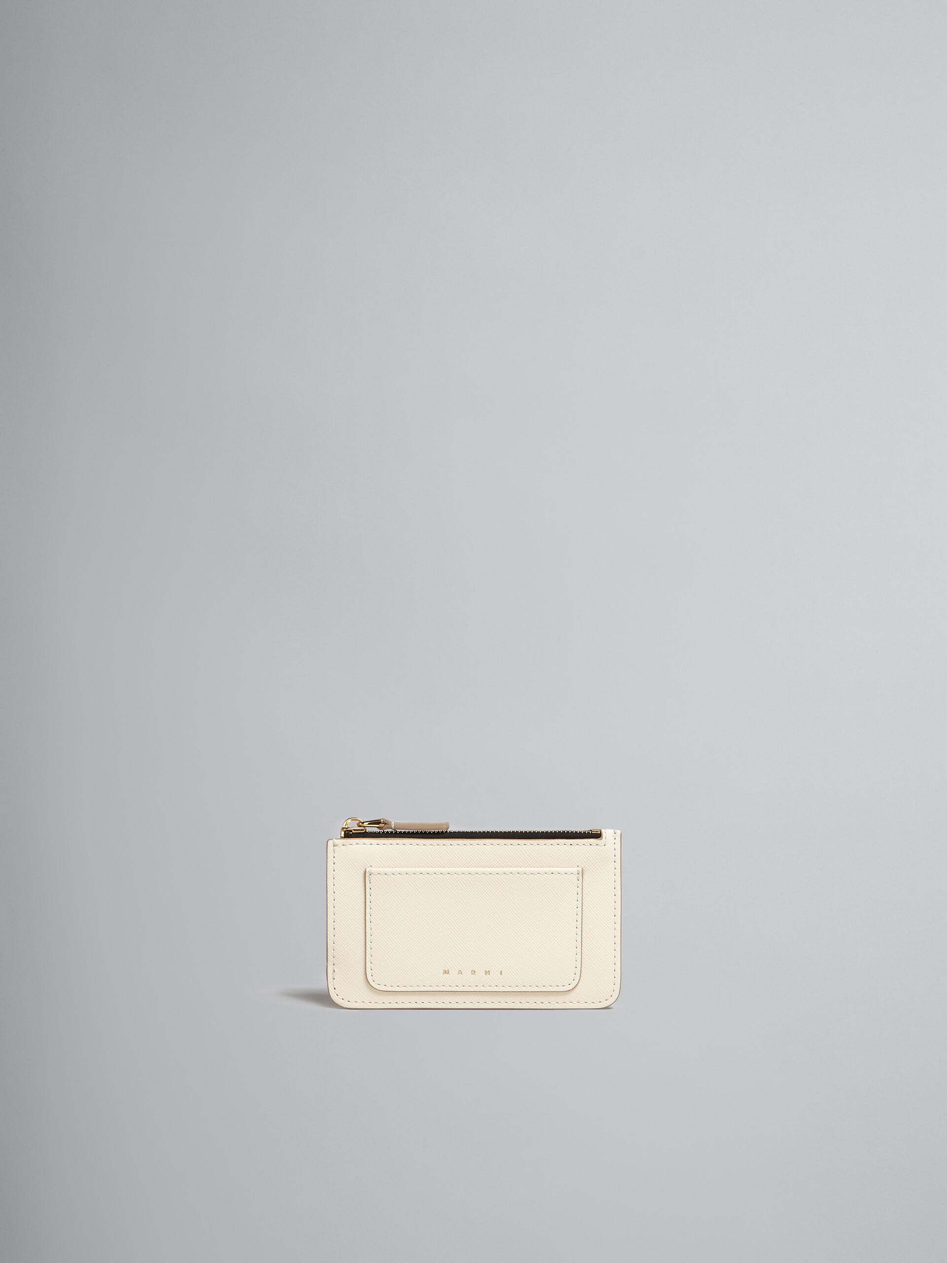 Card holder. 1 zip coin pocket; 4 rear card slots. Gold hardware. Gold printed logo. Made in Italy