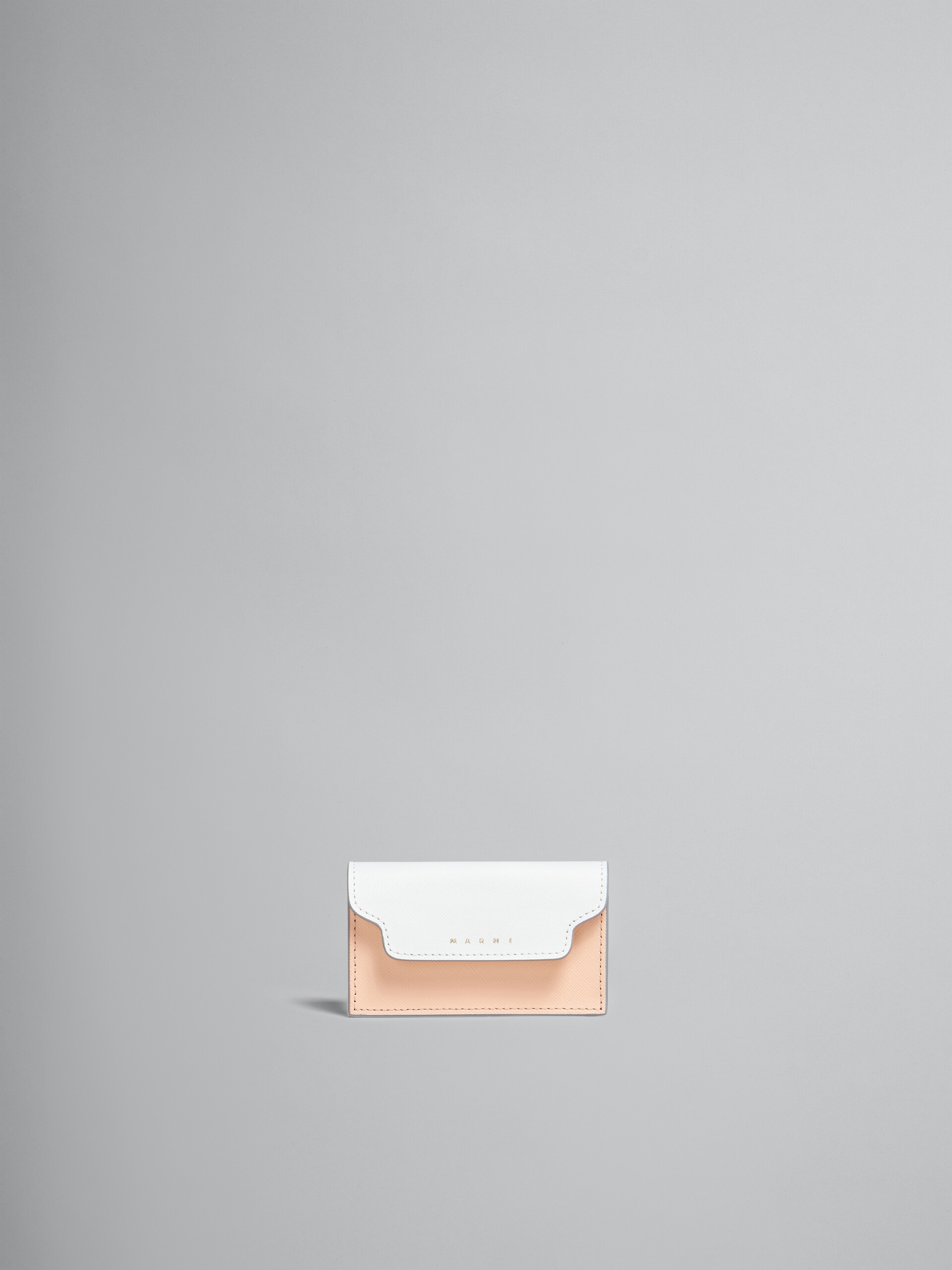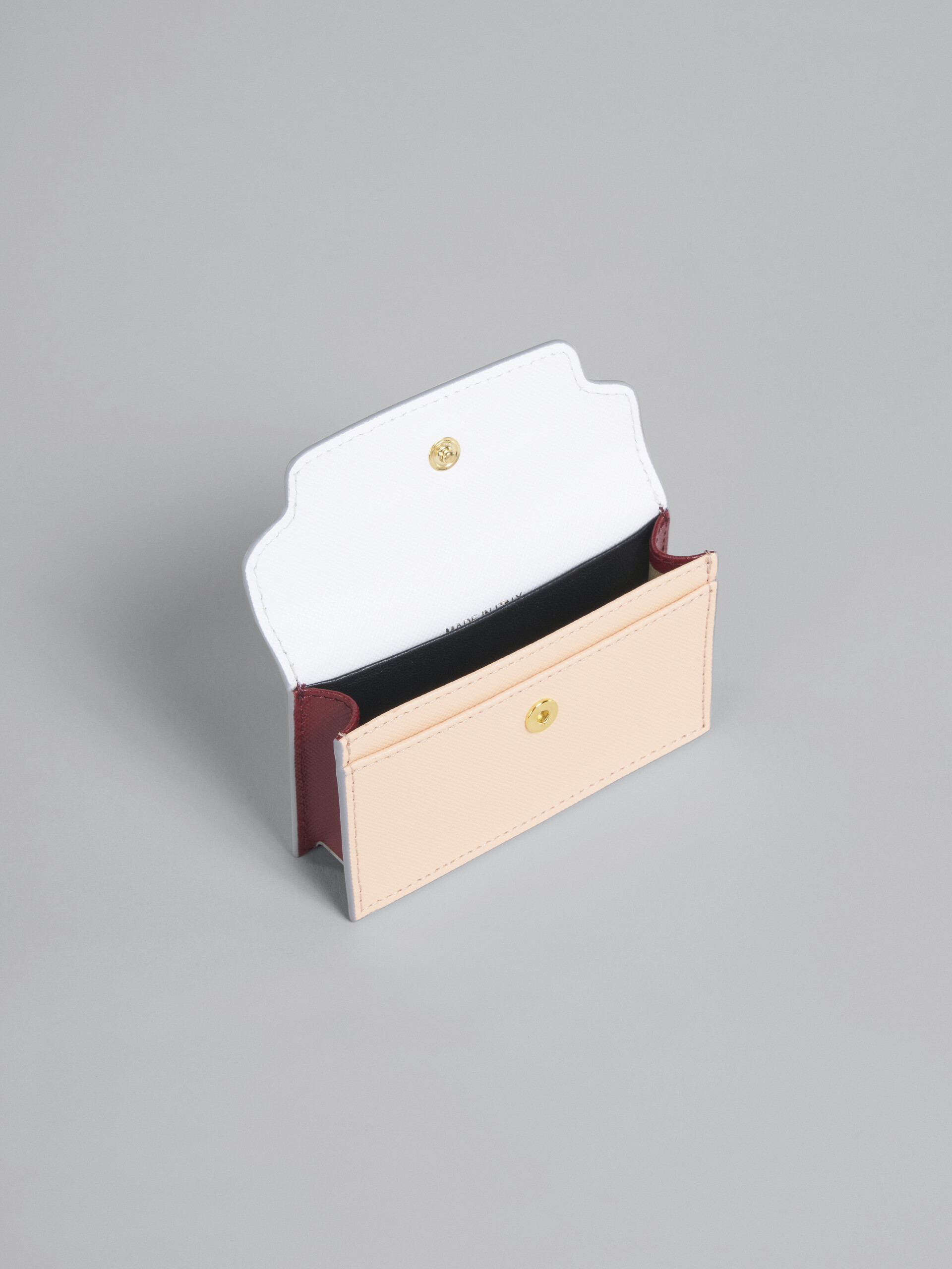 Saffiano leather wallet. Snap-secured; rectangular business card case; 1 business card compartment; 1 credit card slot. Gold hardware. Gold printed logo. Made in Italy