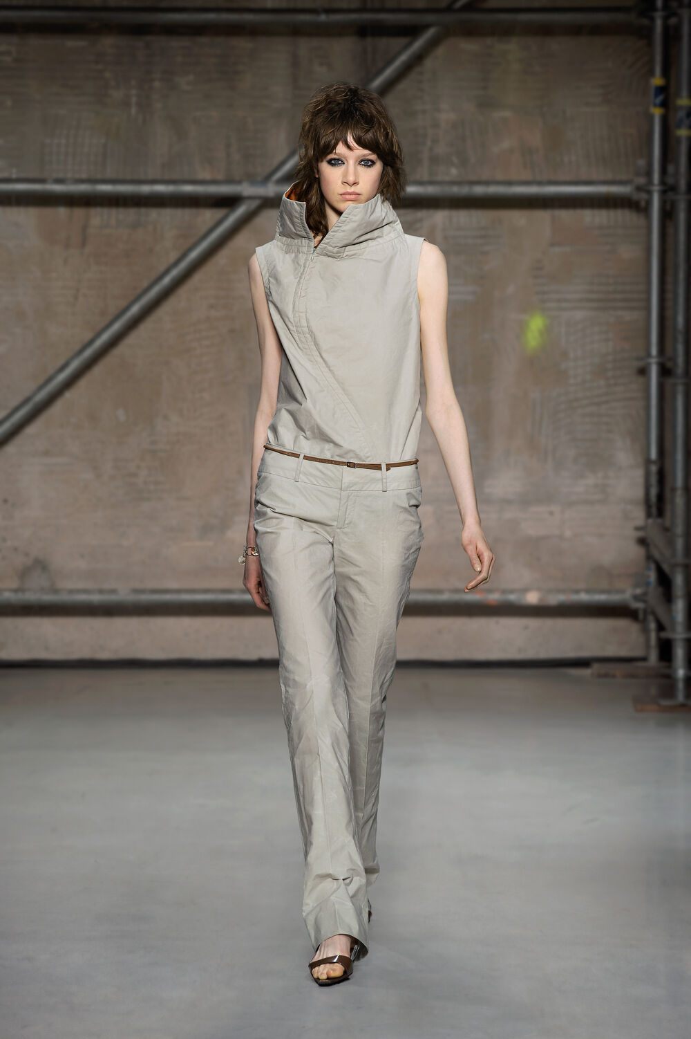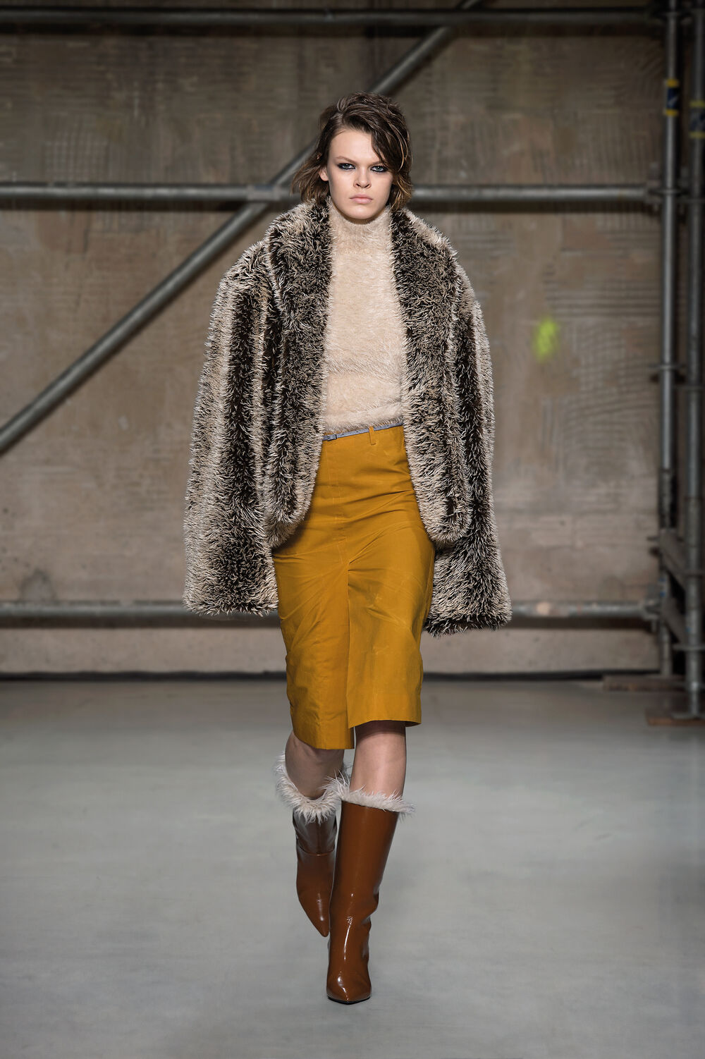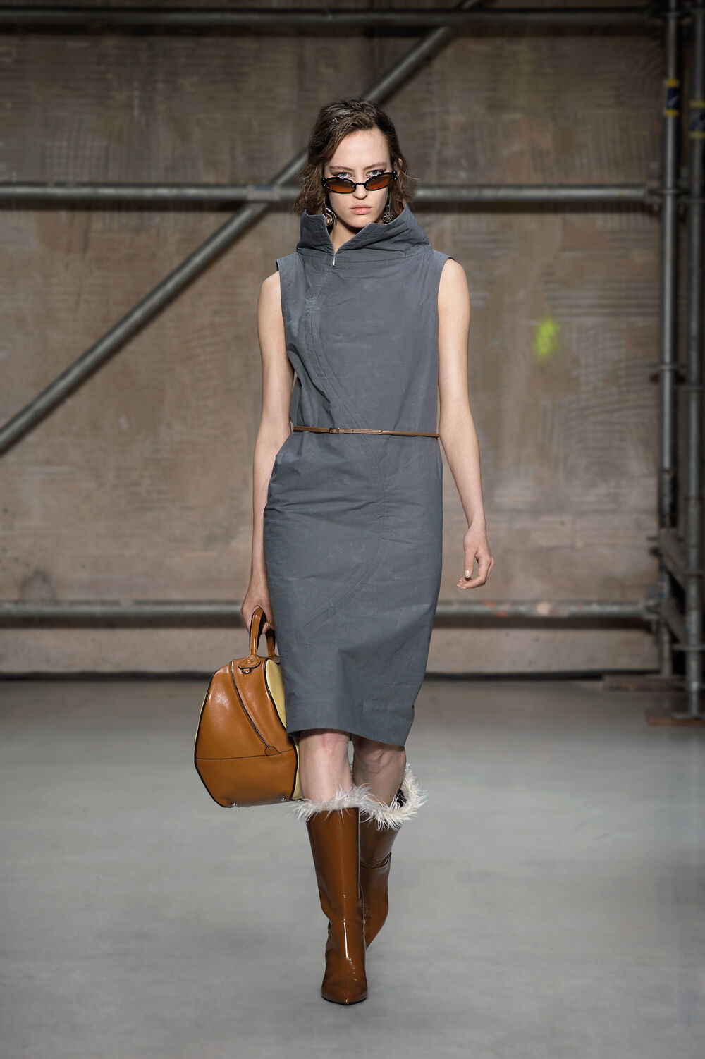 Volumes are reconfigured through drawstrings throughout the collection, while faux furs become sporadic, ironic statements. Accessories are underscored by unexpected combinations of materials, like boxy-shaped handbags featuring geometric patchworks of precious leathers.