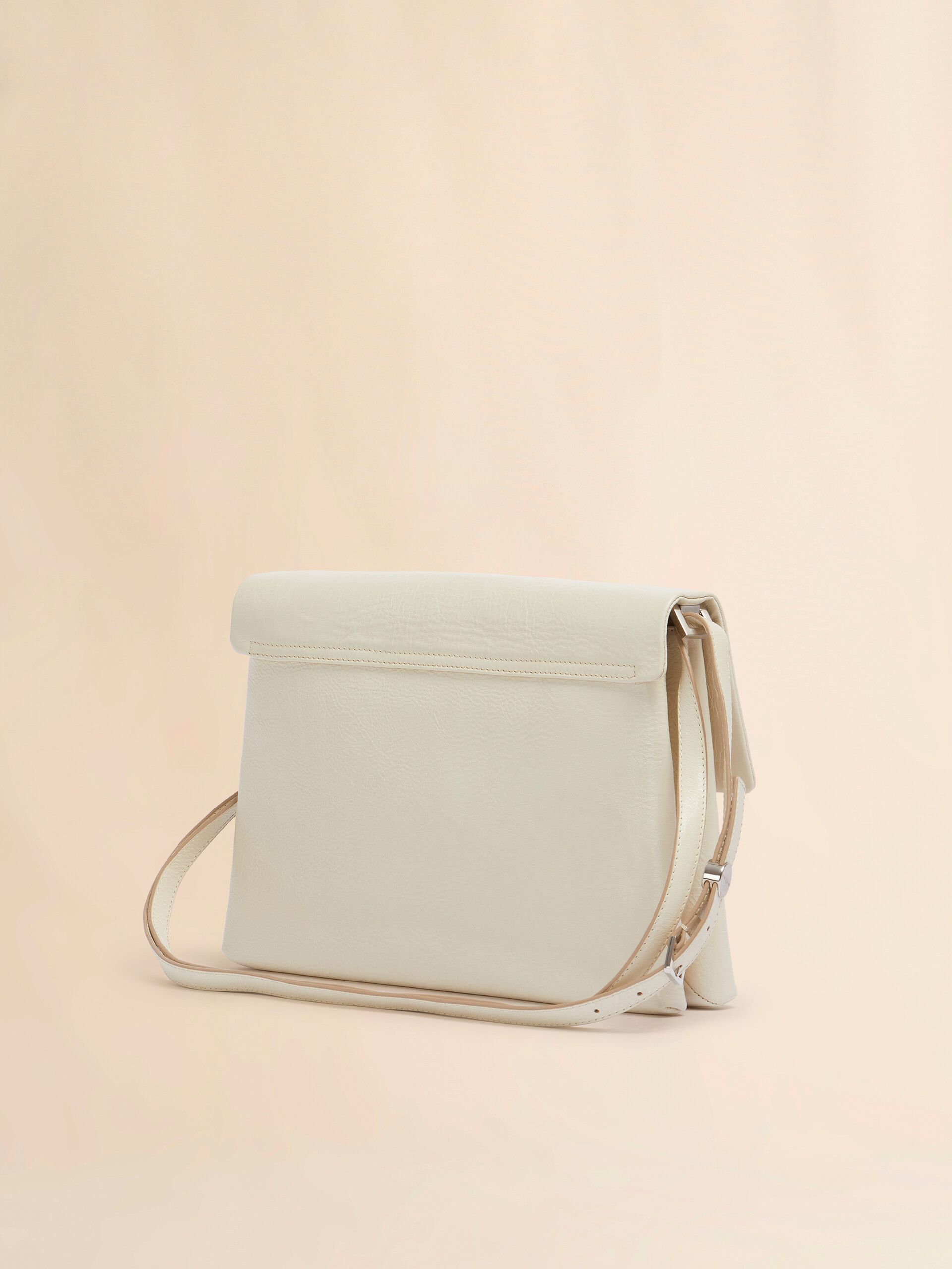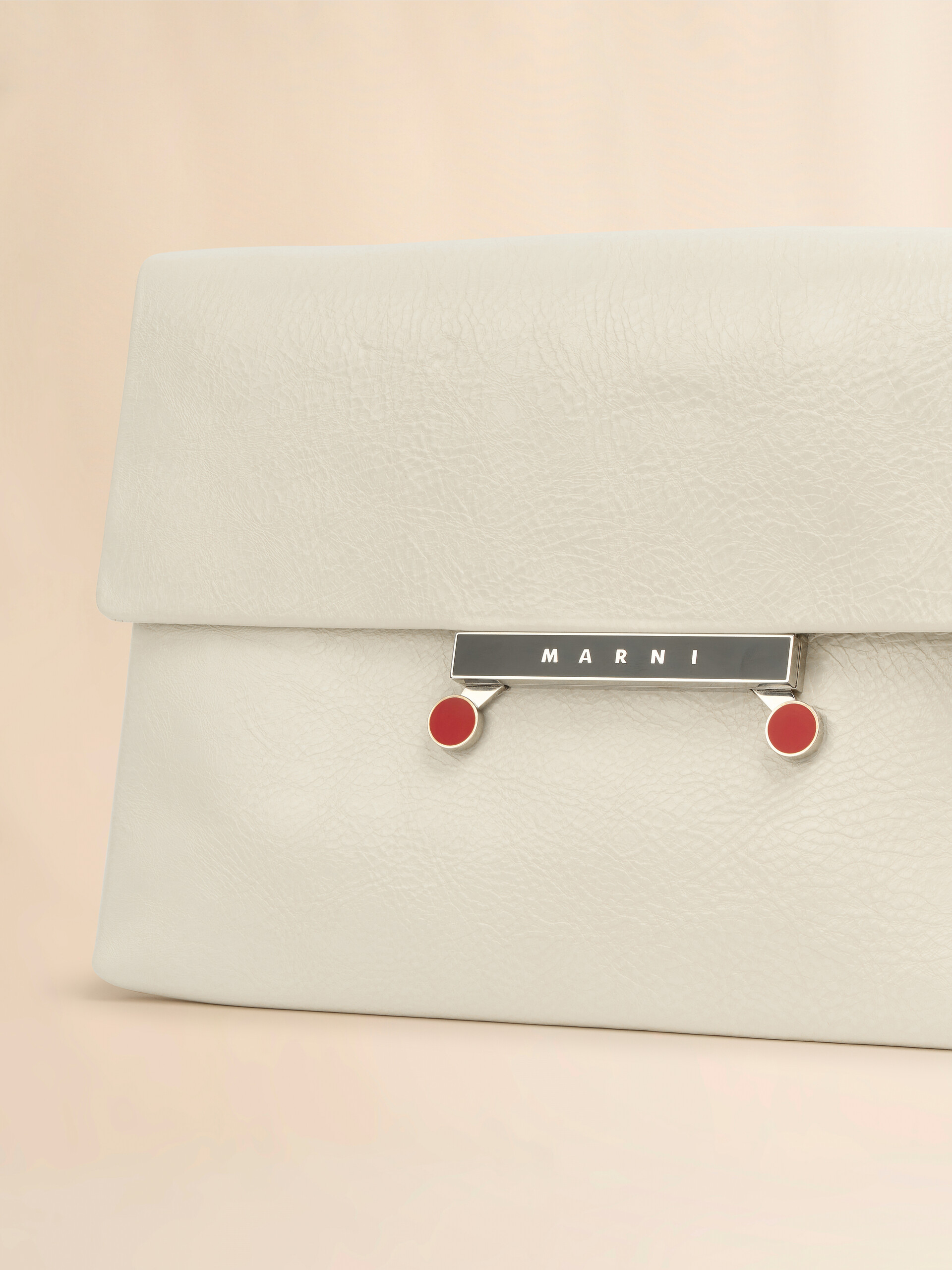 Medium Envelope bag made from patent leather with a tactile craquelé effect. Semi-rigid construction with two inside compartments. Open pocket in the front one, zip pocket in the back. Adjustable buckled shoulder strap: can be worn as a shoulder bag or crossbody. Flap closure with enamelled Marni clasp. Luxurious sheepskin leather lining. Made in Italy