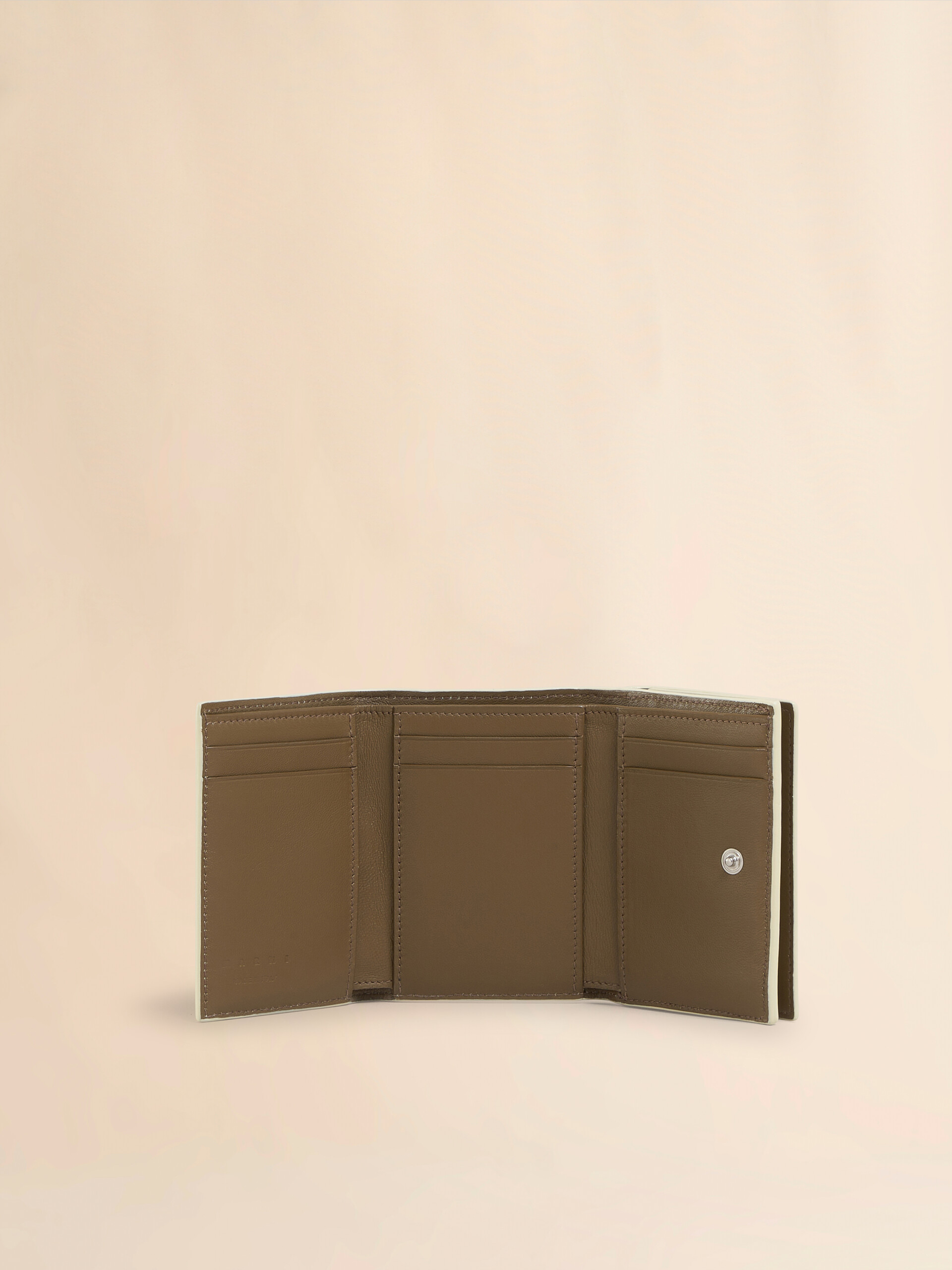 Cartera de tres cuerpos de piel de becerro fresada. Logotipo Marni Mending cosido a mano en la parte delantera. Cierre de botón a presión. Bolsillo para monedas con botón a presión, compartimento para billetes y seis ranuras para tarjetas. Made in Italy