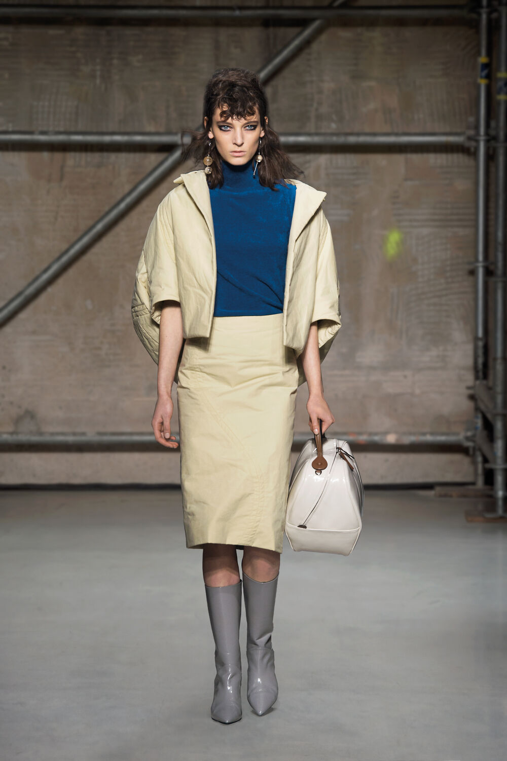 La primera colección de Francesco Risso, director creativo de Marni, explora la feminidad en el acto de descubrir una realidad individual. Las formas globo elevan la silueta y proporcionan una sensación de protección.