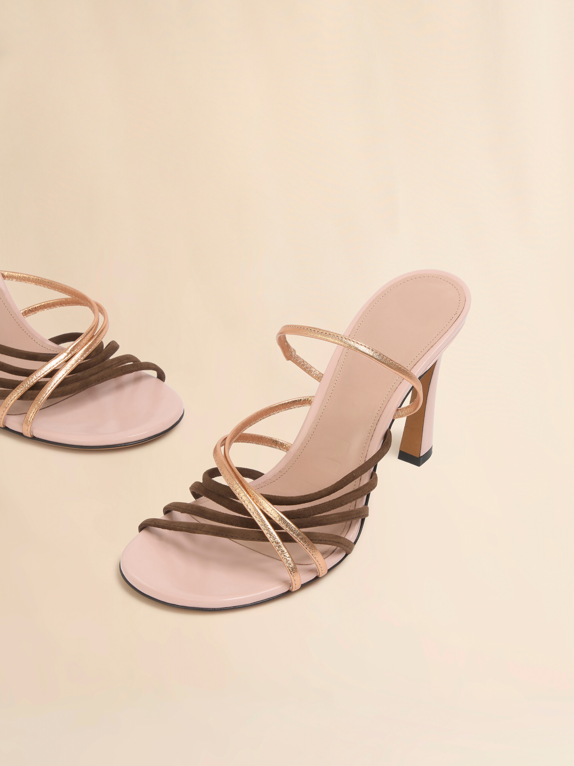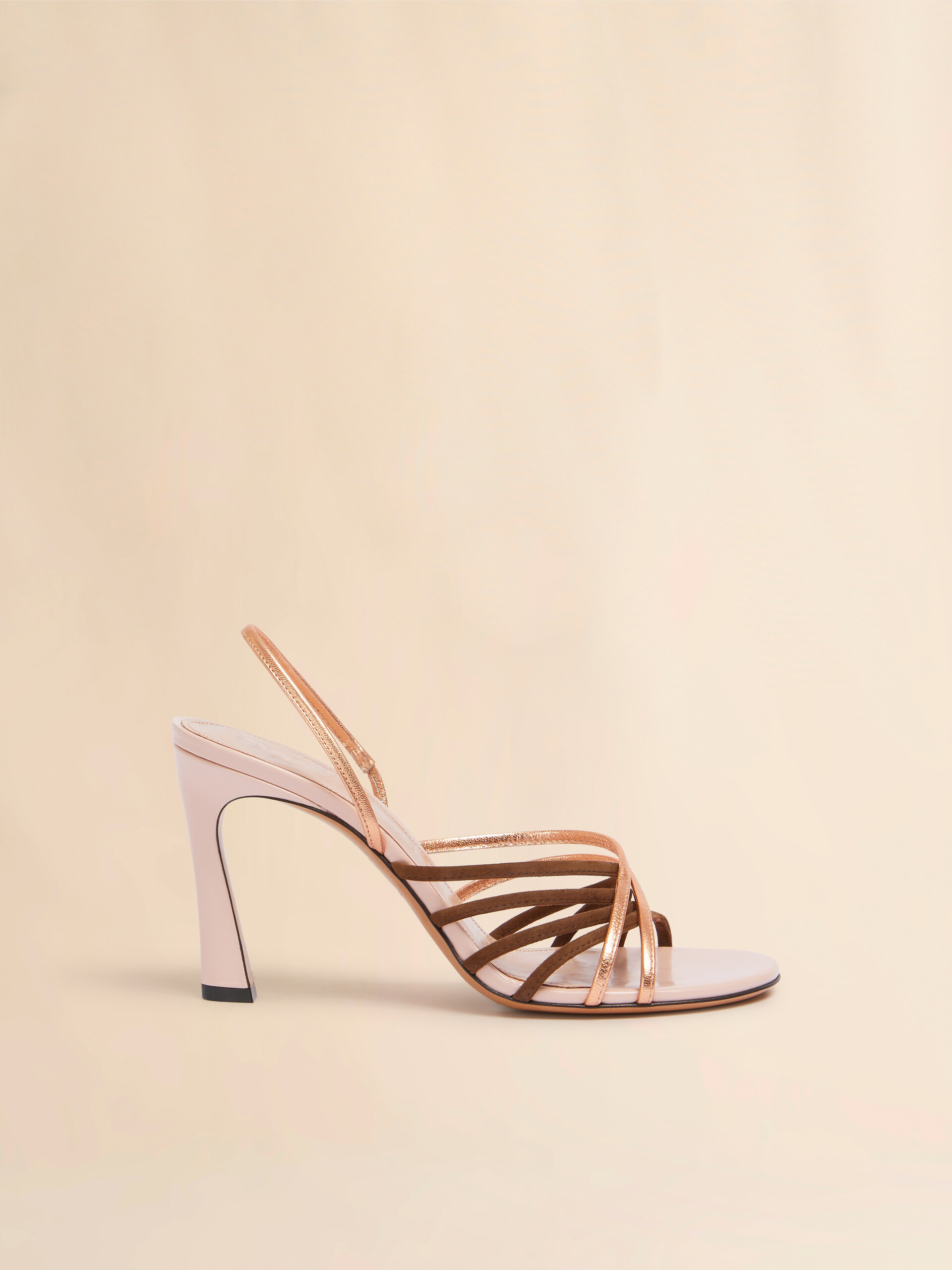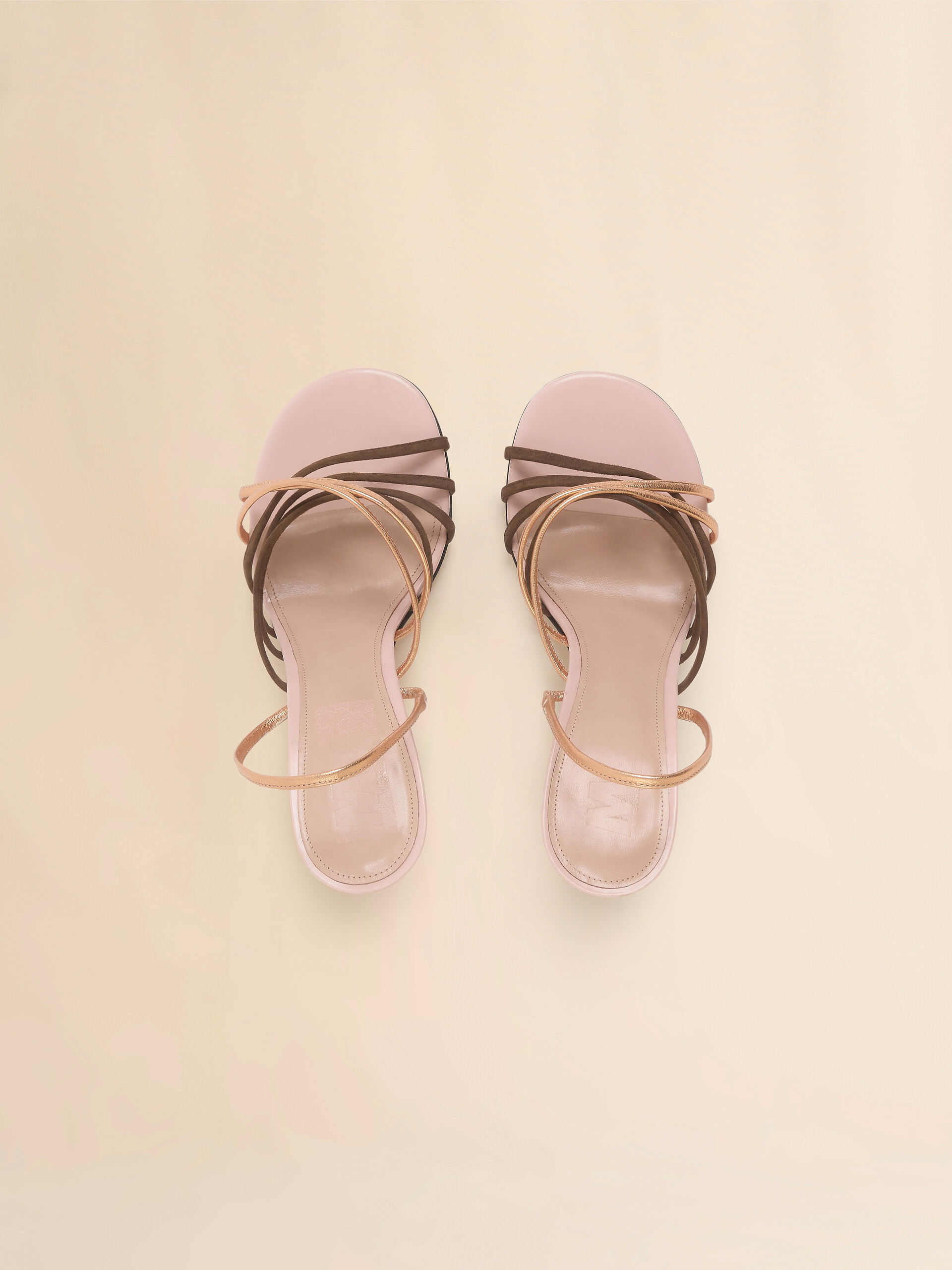 Sandalia de cuero de becerro brillante, que envuelve el pie con finas tiras de ante y cuero metalizado. Silueta con puntera redondeada y correa en el tobillo. Suela de cuero y plantilla blanda con el logotipo de Marni. Made in Italy