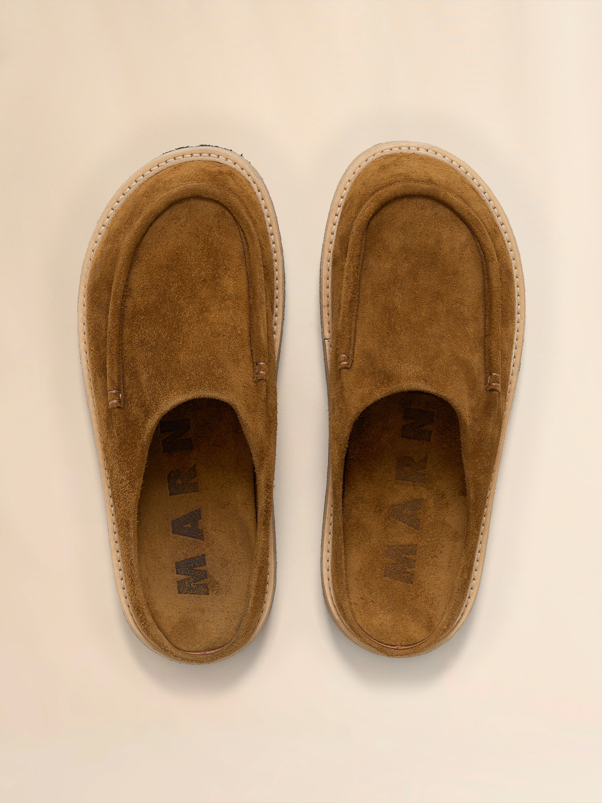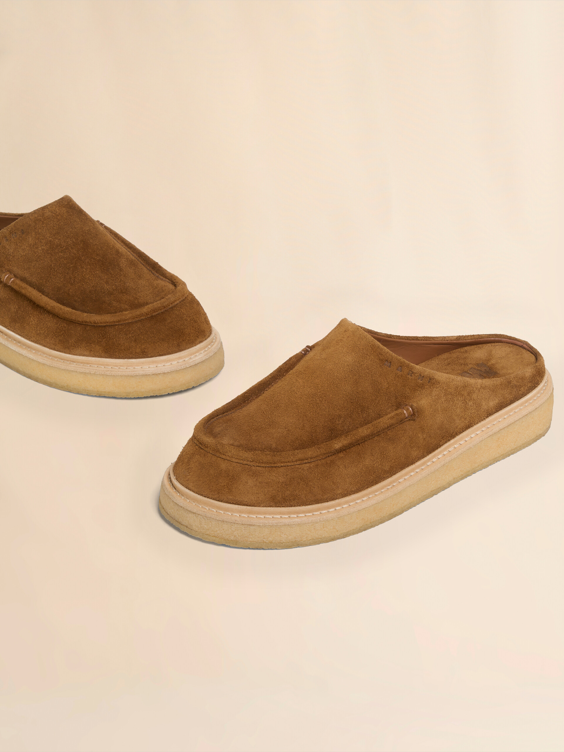 Zueco de ante con costuras en relieve en la parte superior. Suela de goma crepé natural y vira de piel. Acabado con el logotipo de Marni en relieve en el borde.