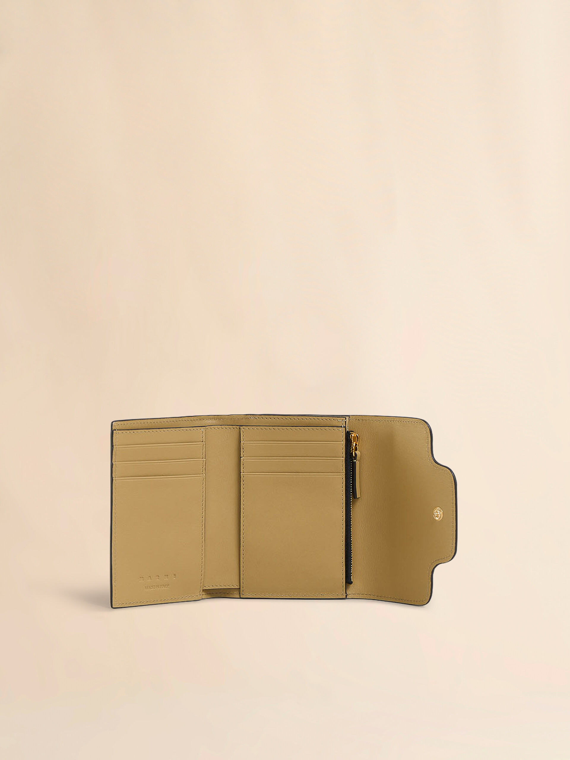Portefeuille à trois volets Trunkaroo confectionné en cuir de veau. Inscription Marni embossée et clous oversize. Fermeture par bouton-pression. Poche zippée pour la monnaie, compartiment pour billets et six fentes pour cartes. Made in Italy