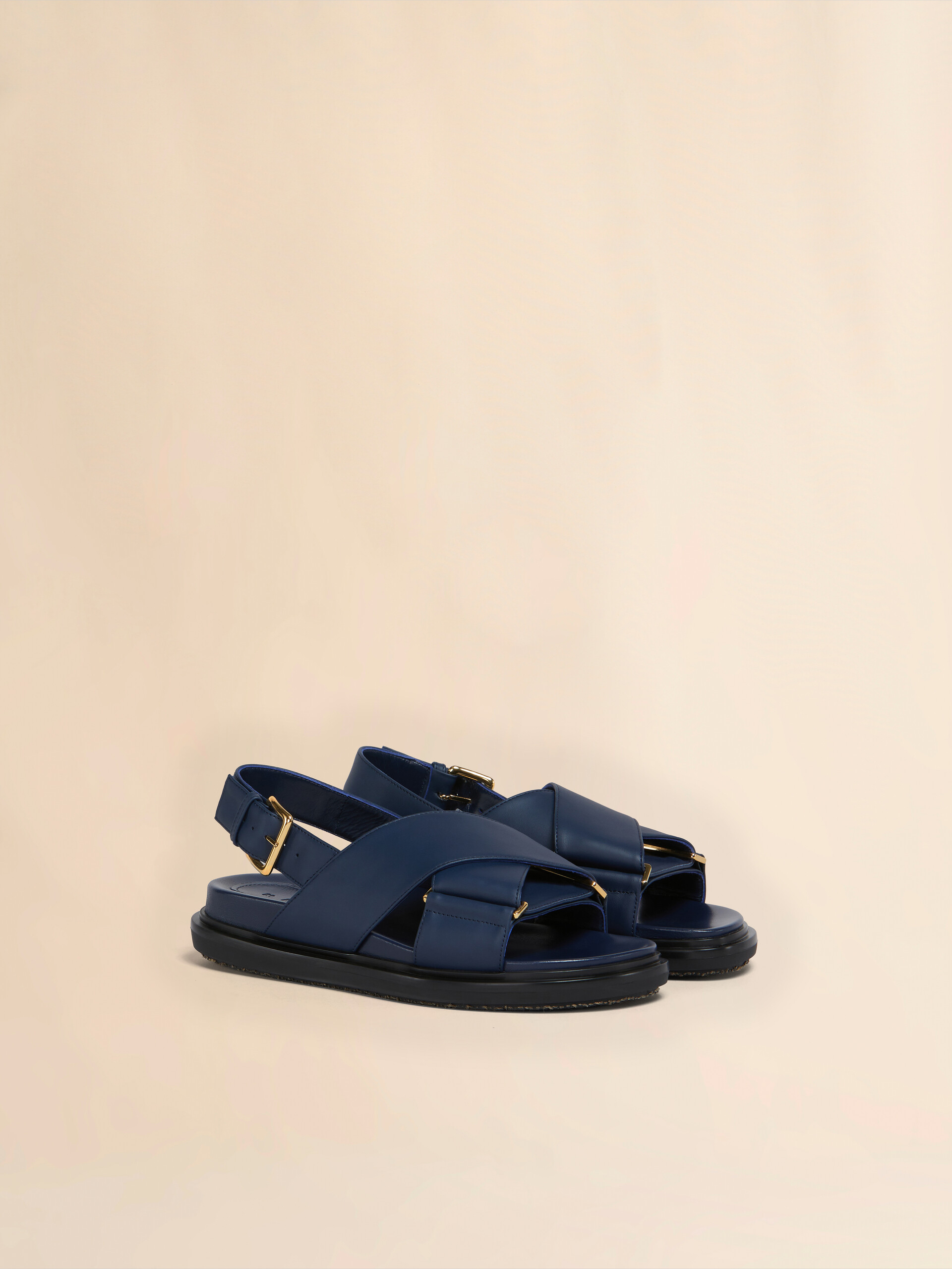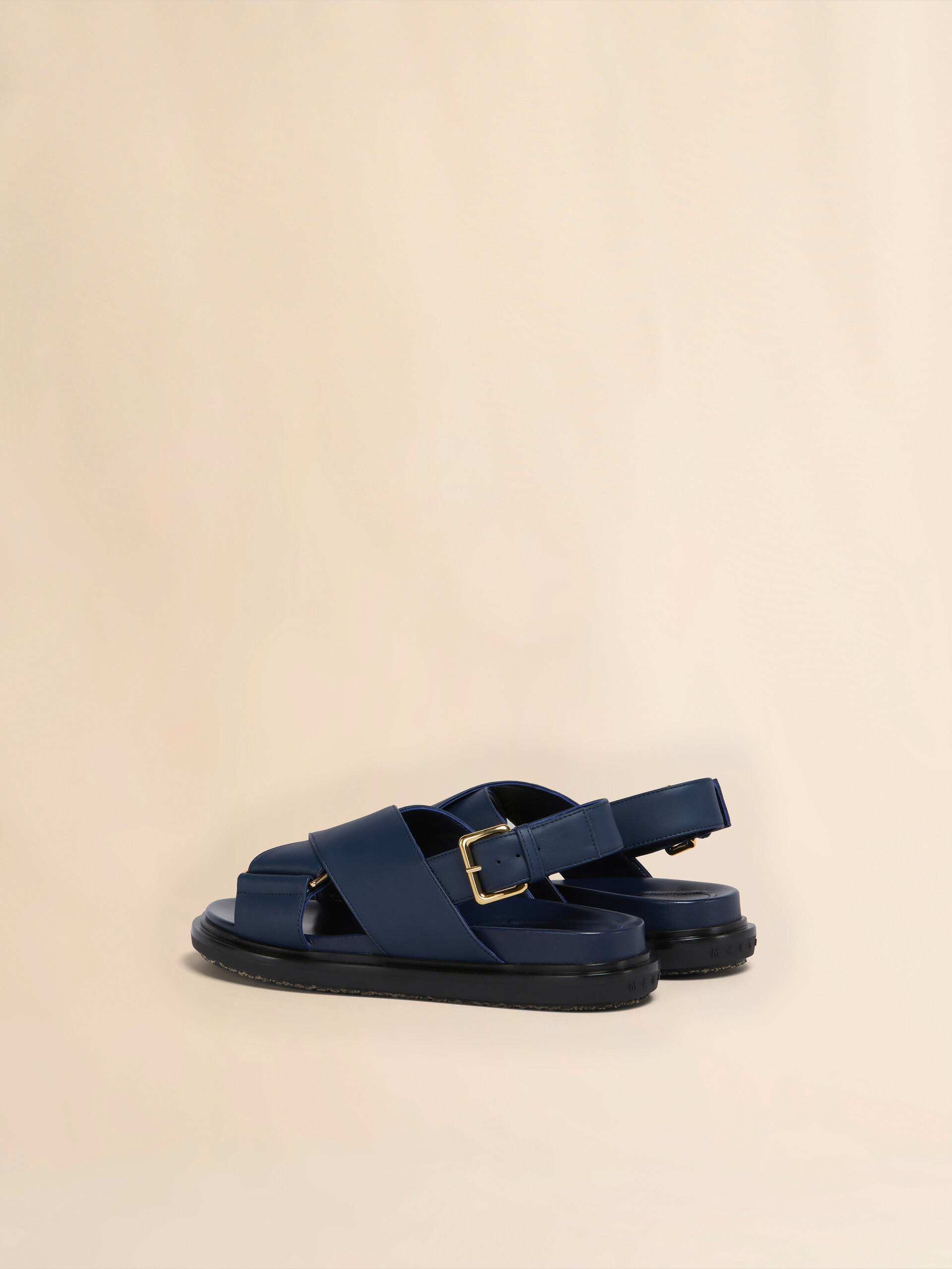 Sandales Fussbett à brides croisées iconiques confectionnées en cuir de veau lisse, dotées d’une fermeture par bride à boucle réglable. Modèle monochrome avec semelle intérieure en cuir ton sur ton et semelle extérieure en caoutchouc. Inscription Marni en relief sur le talon. Made in Italy