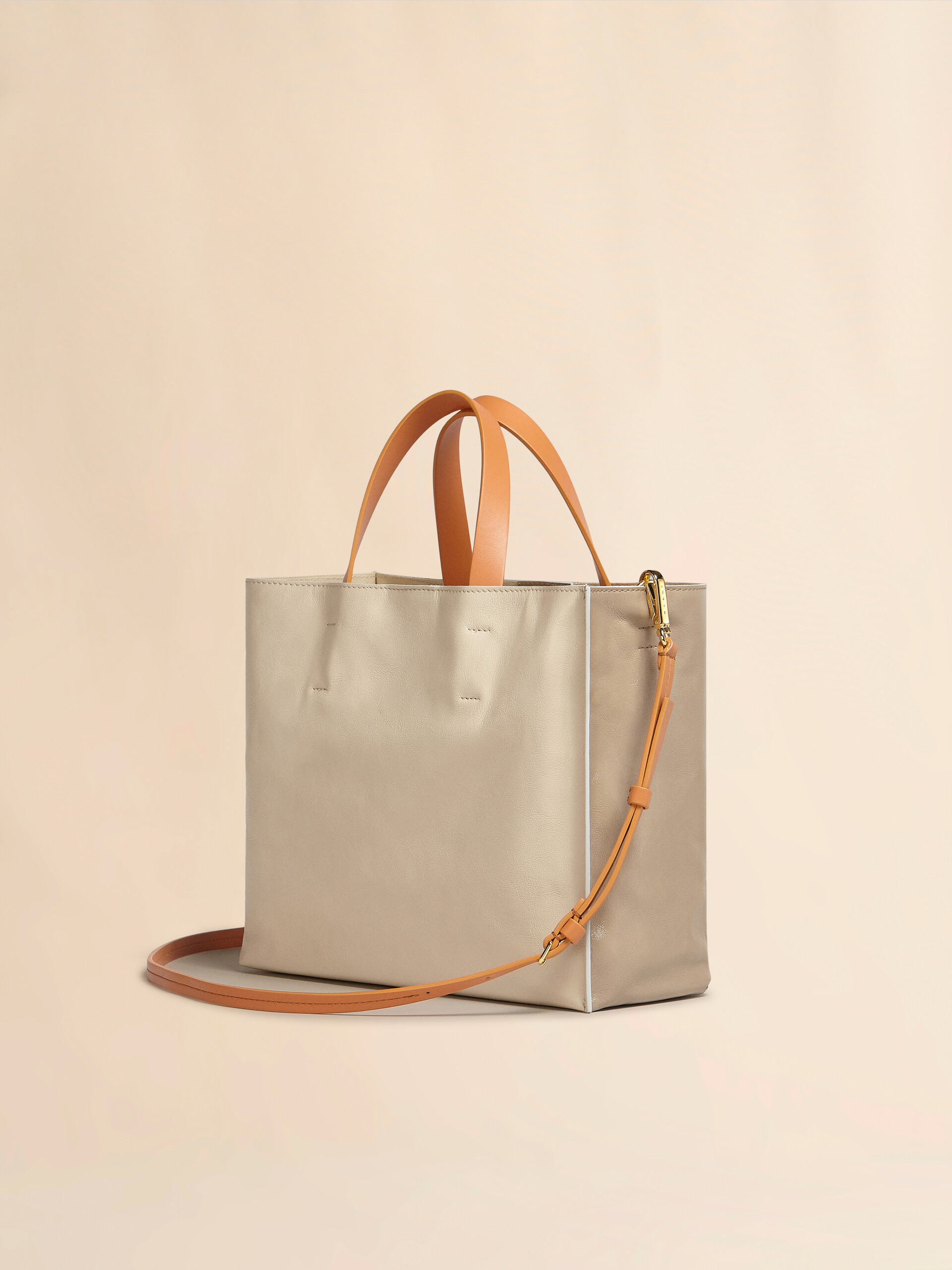 Borsa shopping East/West piccola, in pelle bottalata con chiusura magnetica; tasca interna con zip. Fodera in tessuto. Manici e tracolla staccabile in pelle, regolabile con fibbia. Design color-block. Elementi metallici color oro. Esterno con logo stampato color oro. Made in Italy