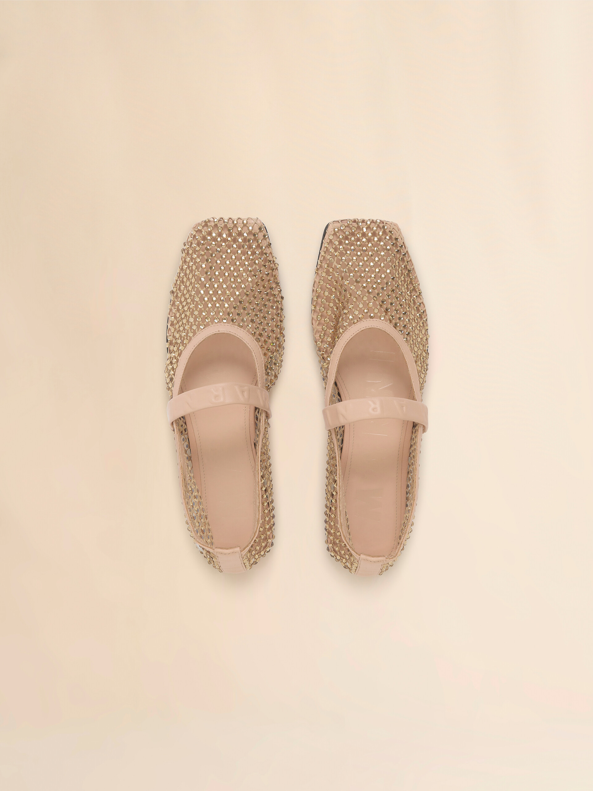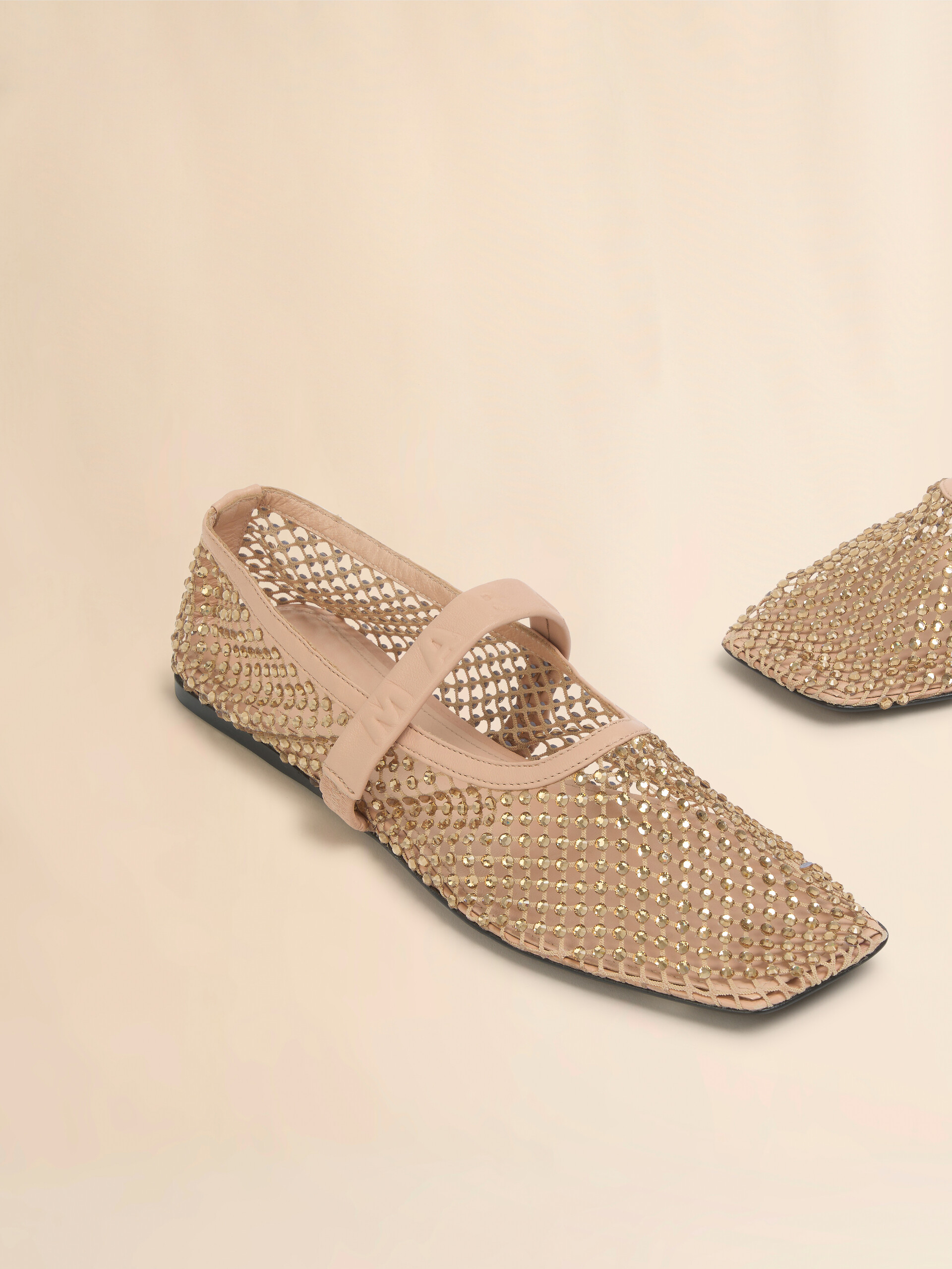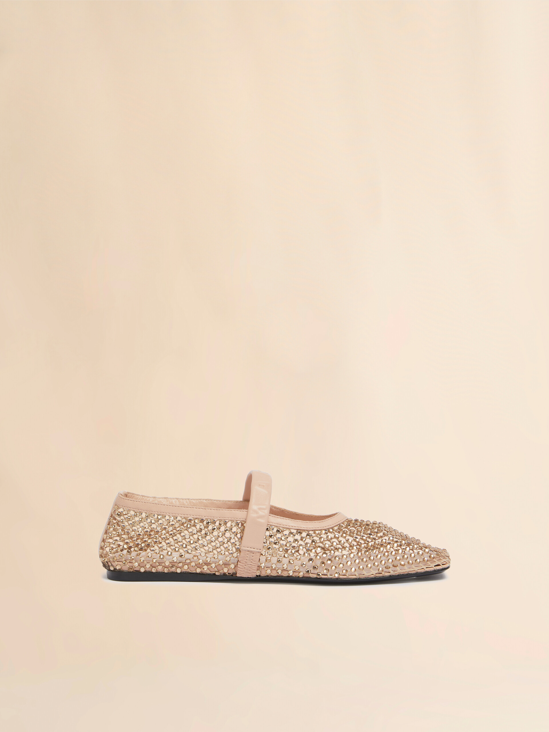 Ballerina Mary Jane realizzata in rete e arricchita da strass all over. Punta quadrata. Cinturino in pelle, decorato con la scritta Marni in rilievo. Il modello è dotato di sacchetto con strass di ricambio. Made in Italy