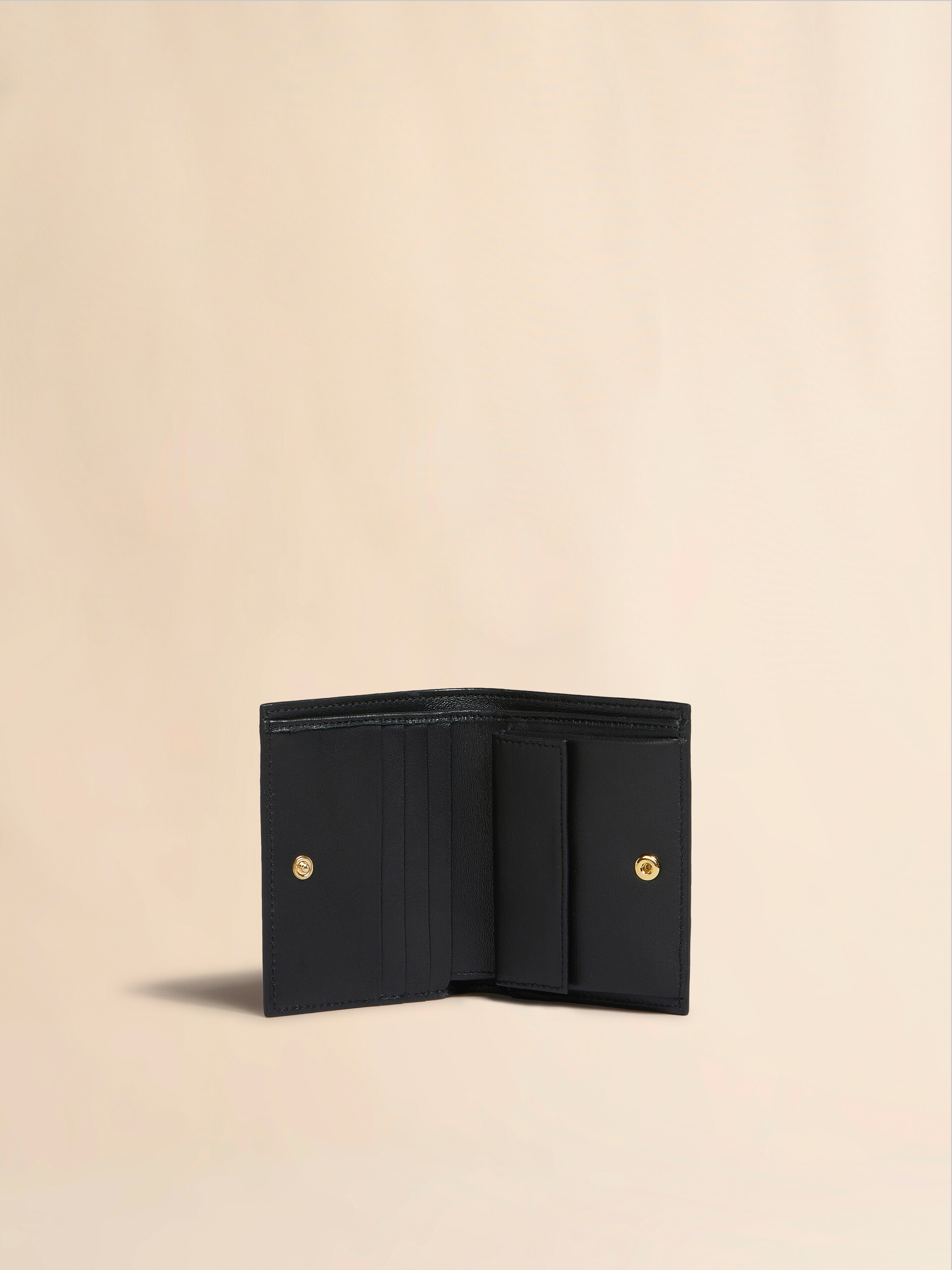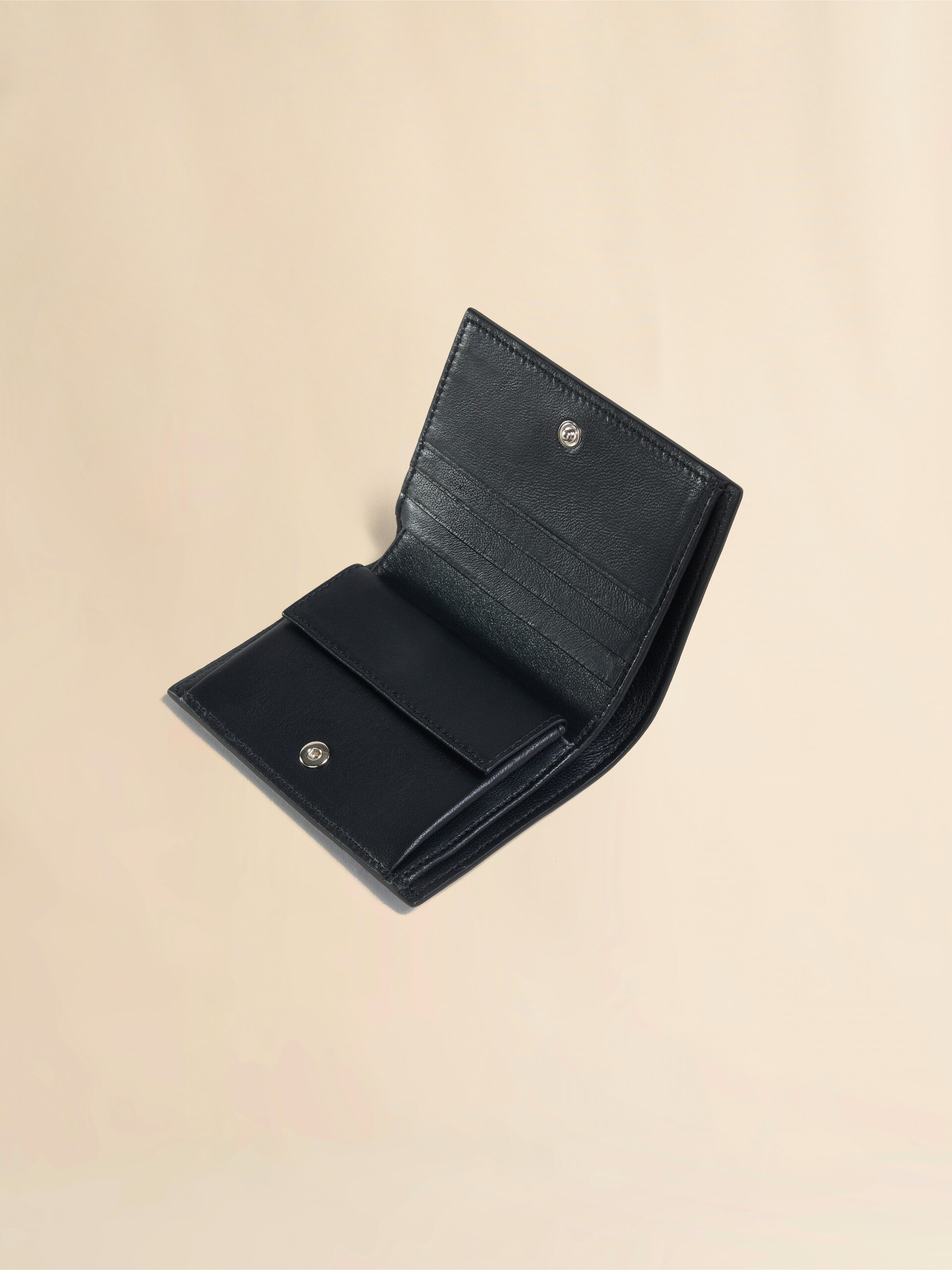 Portafoglio bi-fold realizzato in pelle di vitello bottalato. Logo Marni Mending cucito a mano con dettaglio fiore sul davanti. Chiusura con bottone a pressione. Interno a contrasto con scomparto per banconote, tasca portamonete con bottone a pressione e quattro spazi per le carte. Elementi metallici in palladio. Made in Italy