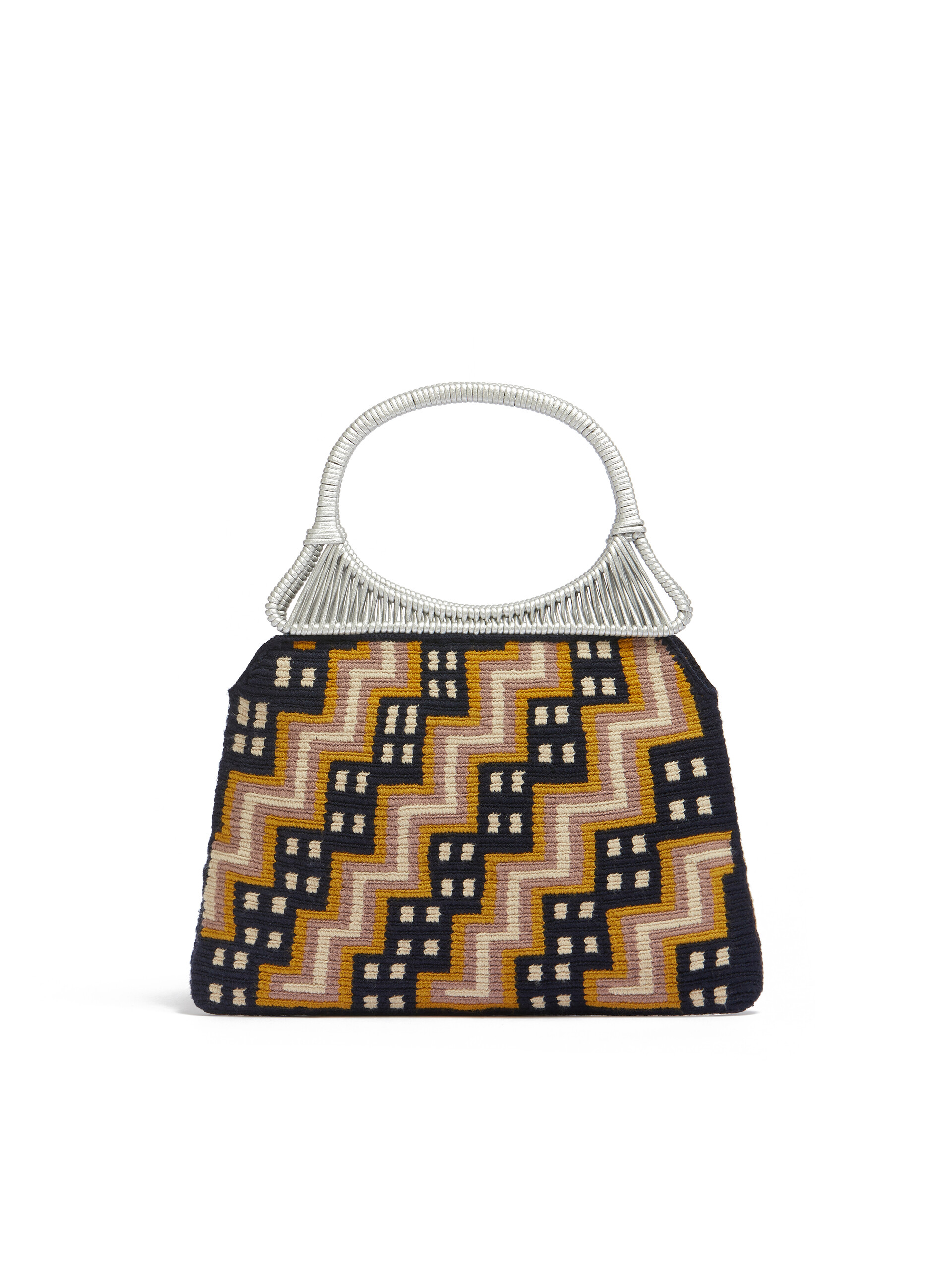 MARNI MARKET特製のハンドバッグ。フラワーデザインのクロシェ製。フラットなヘキサゴナルフォルム、レザーグリップ付きのカラーメタル製ツインハンドル。フロントにMARNIロゴのブラックレザー製タグ。このアイテムはハンドメイドのため、画像とは若干異なる場合があります。MARNI MARKETでは、2015年よりコロンビアのアーティザンコミュニティとのコラボレーションを展開し、彼らの手で実現された限定シリーズの家具や、ホームアクセサリー、バッグを紹介しています。
