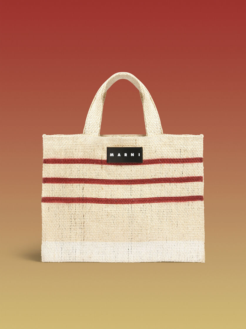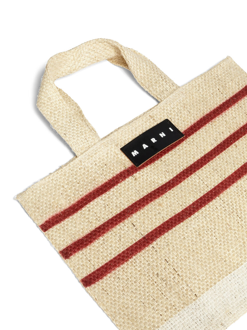 天然繊維製 MARNI MARKET バッグ。ツインハンドル、ストライプデザイン East-Westショッピングバッグ。ブラックレザー製、外側にブランドネーム入りタグ。ハンドメイドの製品は、多少の違いを伴うことがあります。MARNI MARKETでは、2015年よりコロンビアのアーティザンコミュニティとのコラボレーションを展開し、彼らの手で実現された限定シリーズの家具や、ホームアクセサリー、バッグを紹介しています。