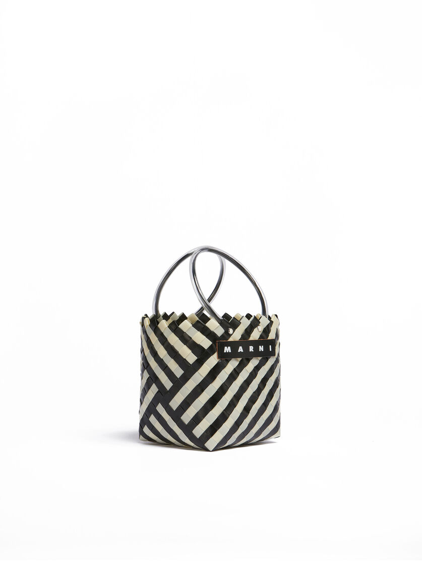 MARNI MARKET特製のTAHAバッグ。内側に透明のコントラスト ロールハンドル、斜め織りのショッパー。ジグザグ仕上げのアッパーエッジ。フロントにMarniロゴのブラックレザー製タグ。このアイテムはハンドメイドのため、画像とは若干異なる場合があります。MARNI MARKETでは、2015年よりコロンビアのアーティザンコミュニティとのコラボレーションを展開し、彼らの手で実現された限定シリーズの家具や、ホームアクセサリー、バッグを紹介しています。
