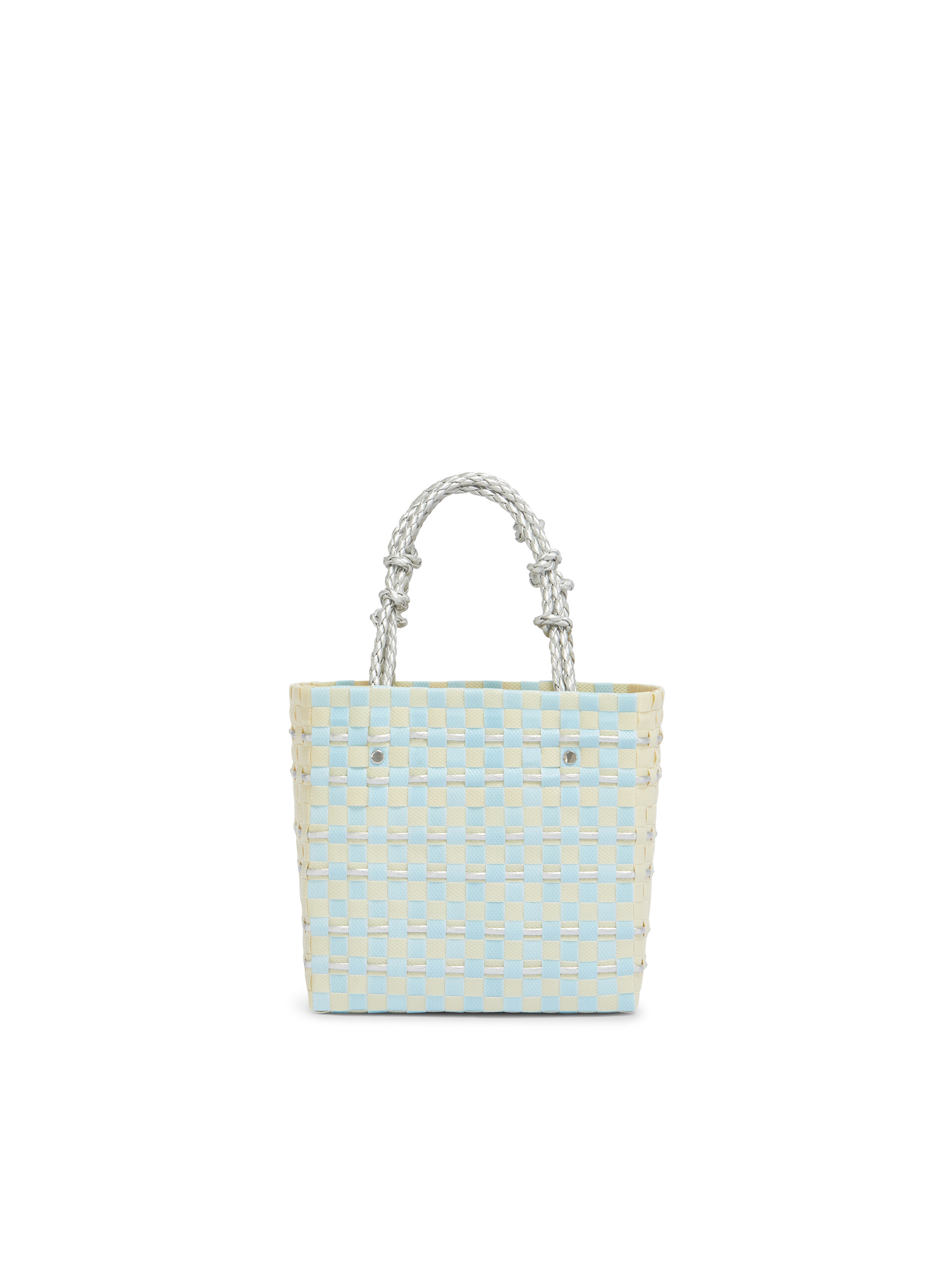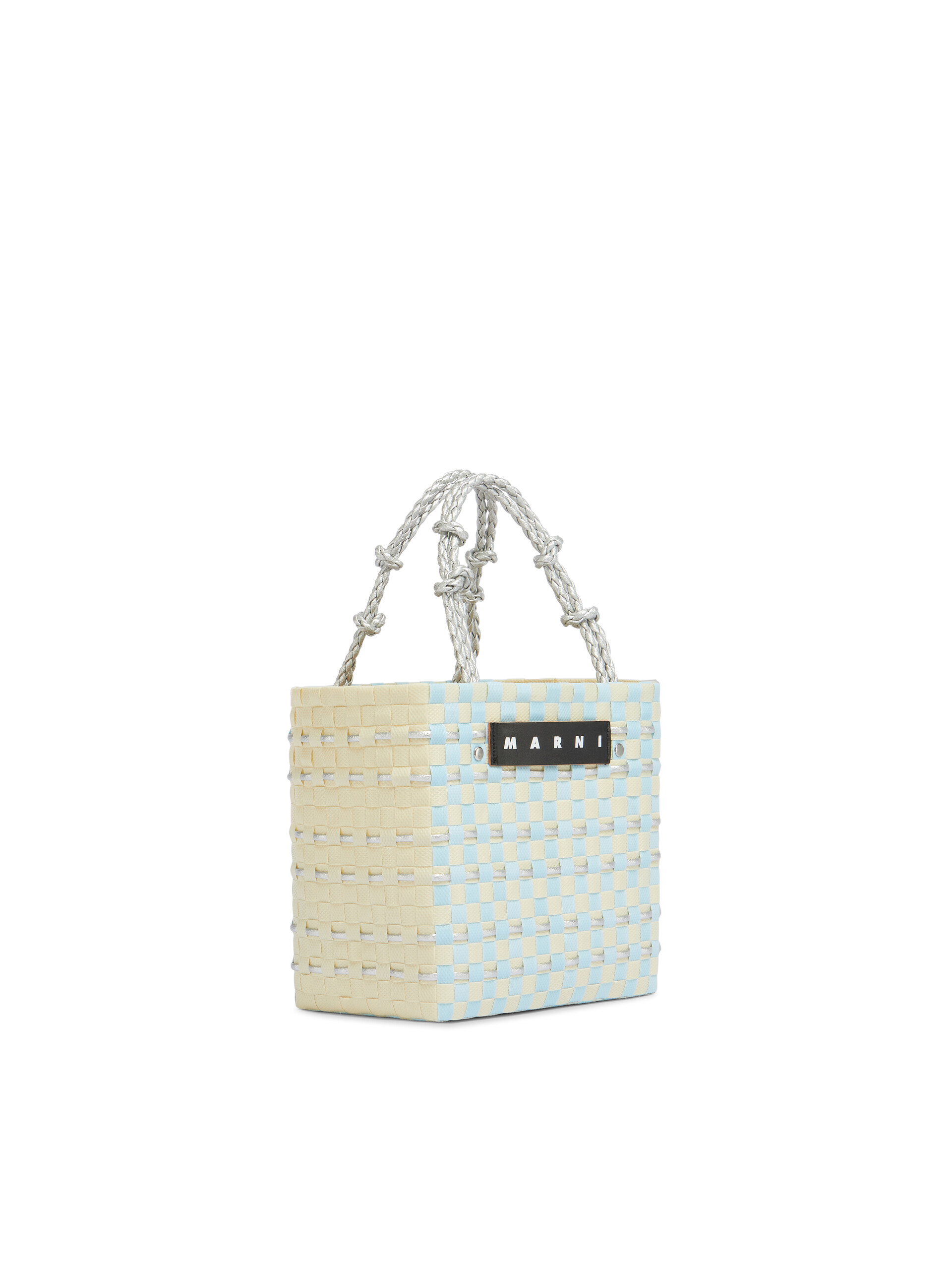MARNI MARKET バスケットバッグ。ウーブンショッパー、フロントとバックにツートーンのチェッカーボード、メタリックなナローストライプ。メタリックなブレードハンドル、ノット付き。フロントにMARNIロゴのブラックレザー製タグ。このアイテムはハンドメイドのため、画像とは若干異なる場合があります。