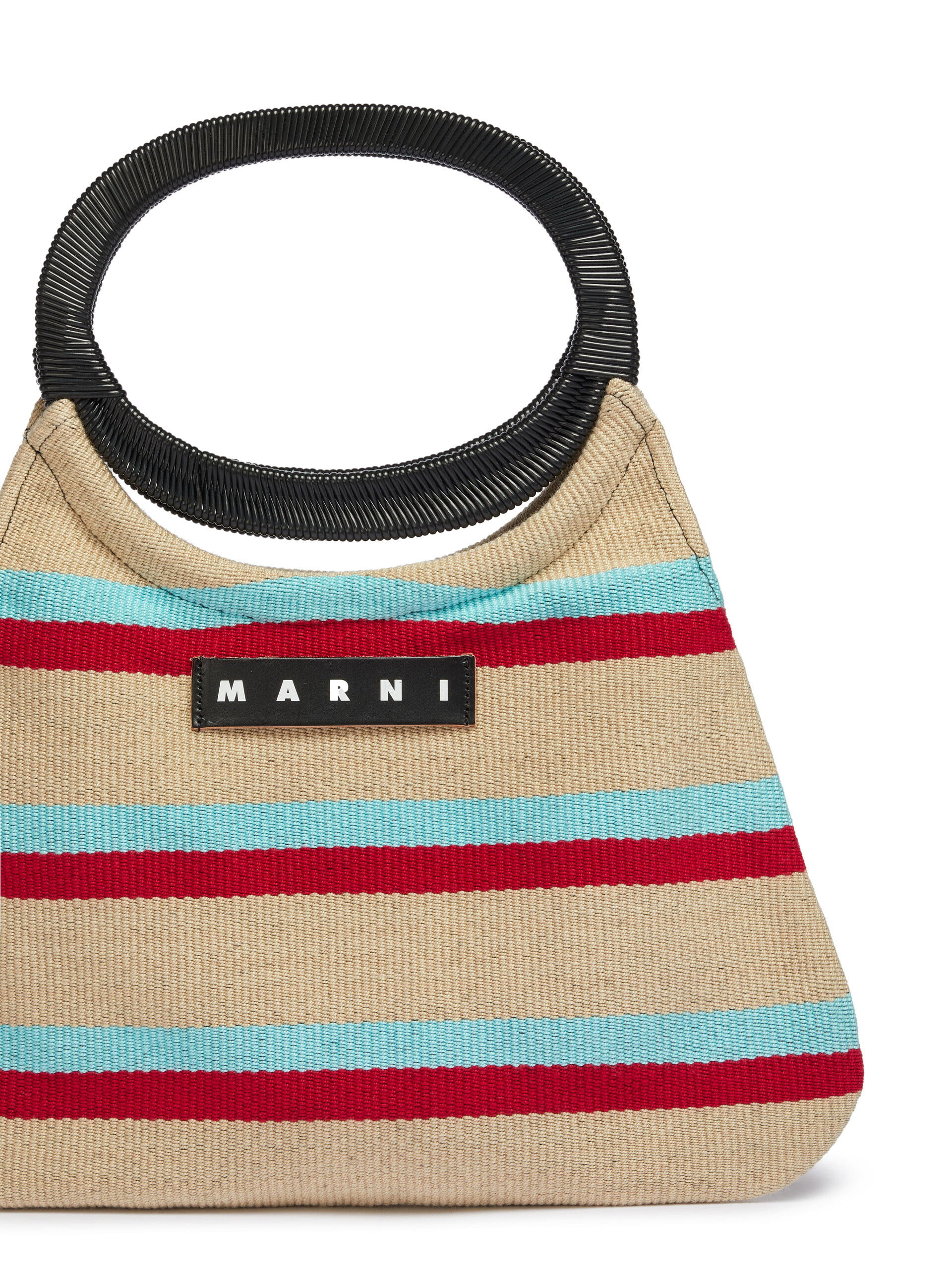 MARNI MARKET コットン製のボートバッグ。リジッドコード製ハンドル、マルチカラーのストライプデザイン。トラペーズシルエット。ブラックレザー製のロゴタグ。コロンビアの職人によって一点ずつ製作されているため、柄の配置、仕上がり、寸法に個体差があります。MARNI MARKETでは、2015年よりコロンビアのアーティザンコミュニティとのコラボレーションを展開し、彼らの手で実現された限定シリーズの家具や、ホームアクセサリー、バッグを紹介しています。