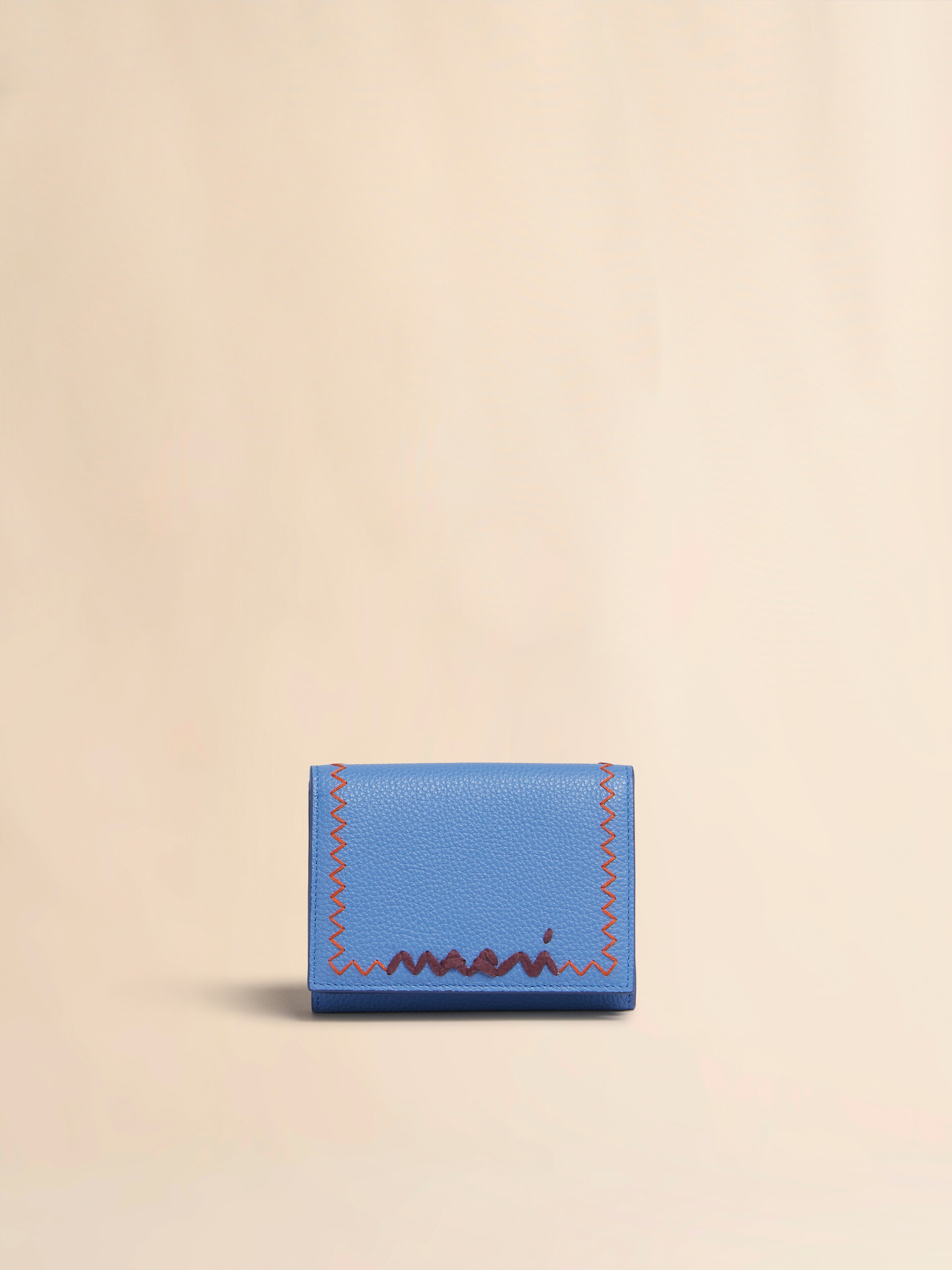 ライトブルー レザー製 三つ折りウォレット、マルニメンディング刺しゅう - 財布 - Image 1